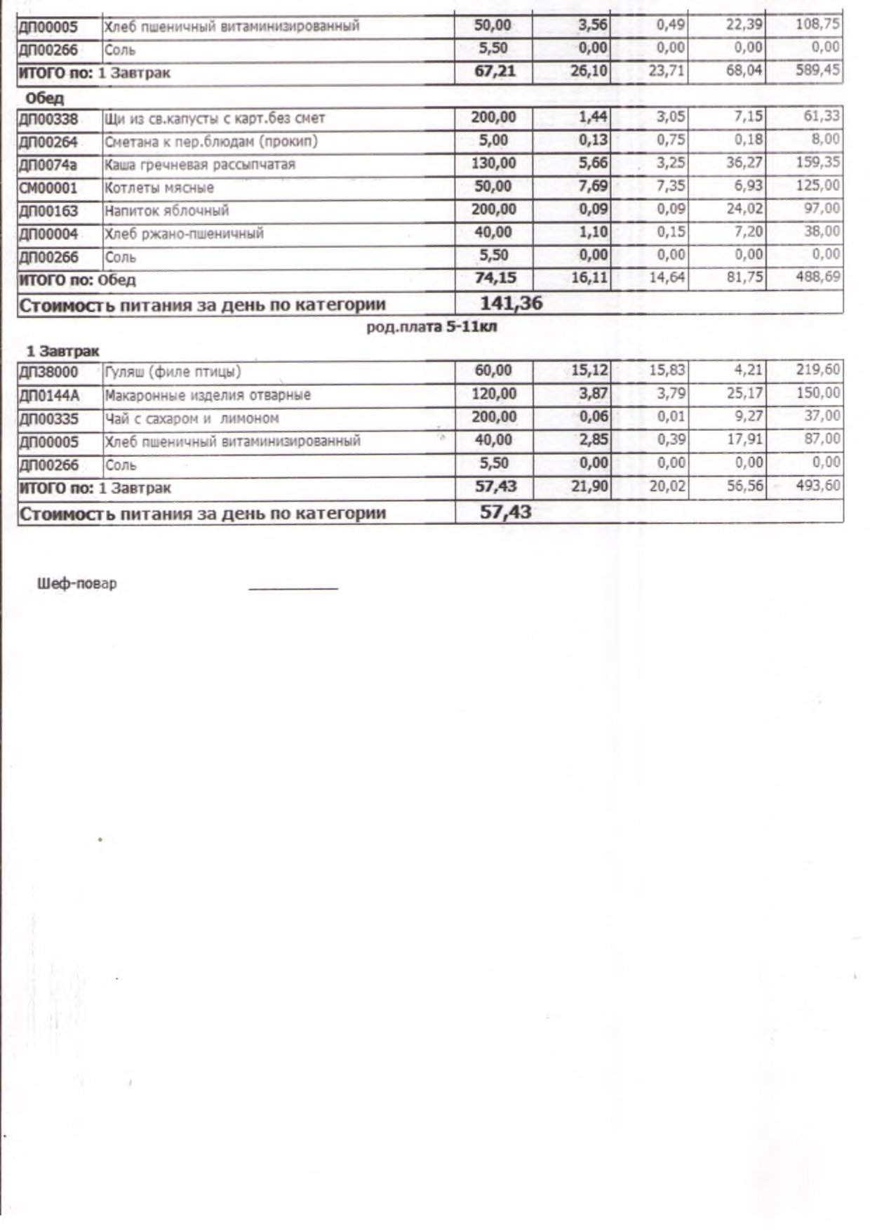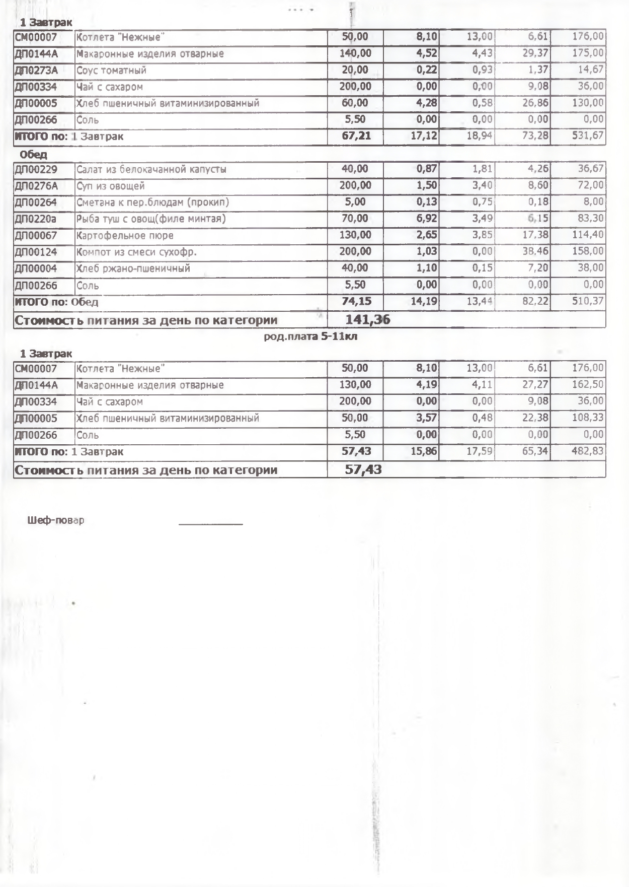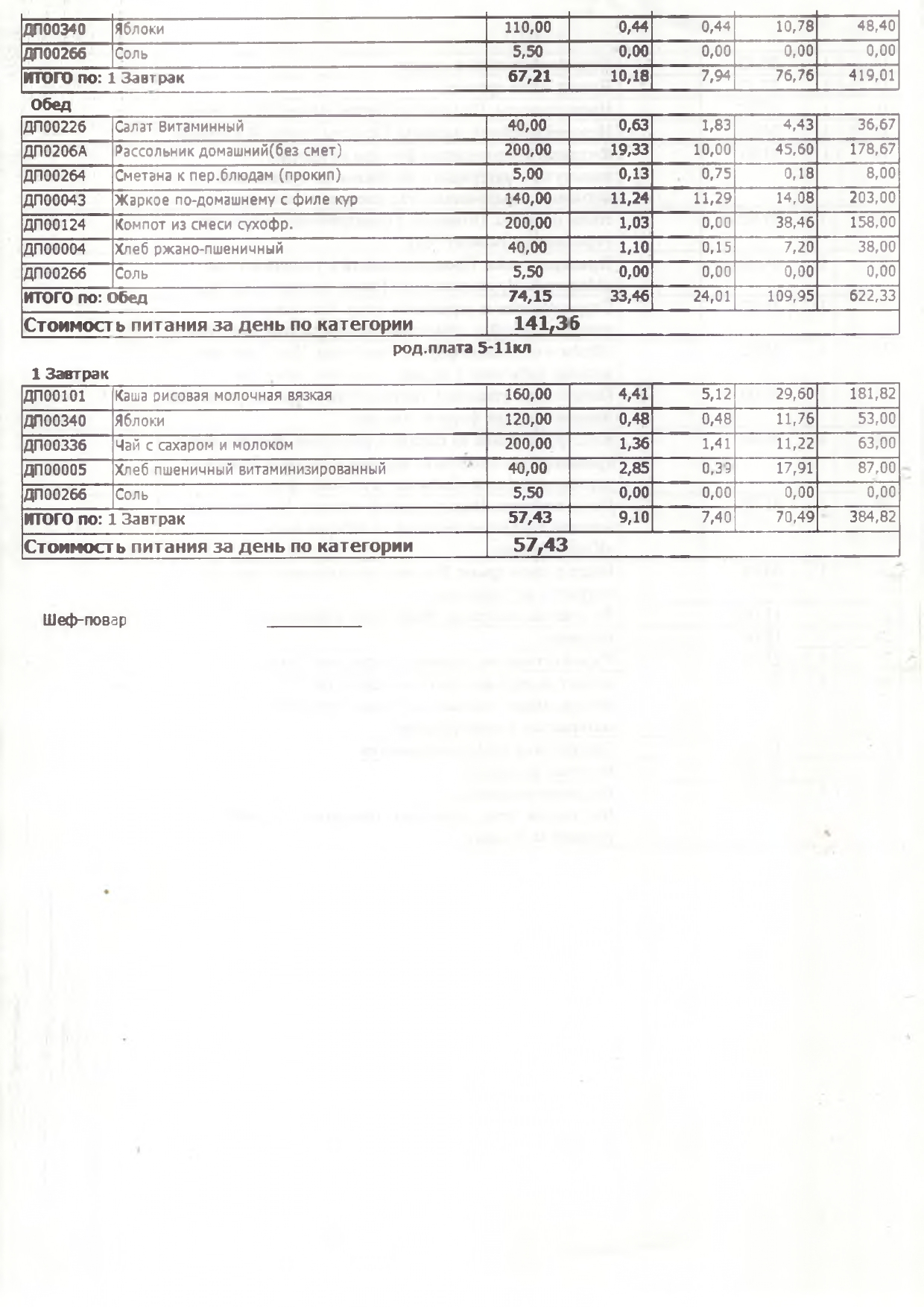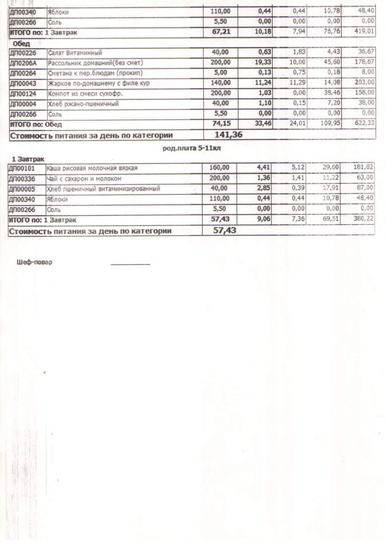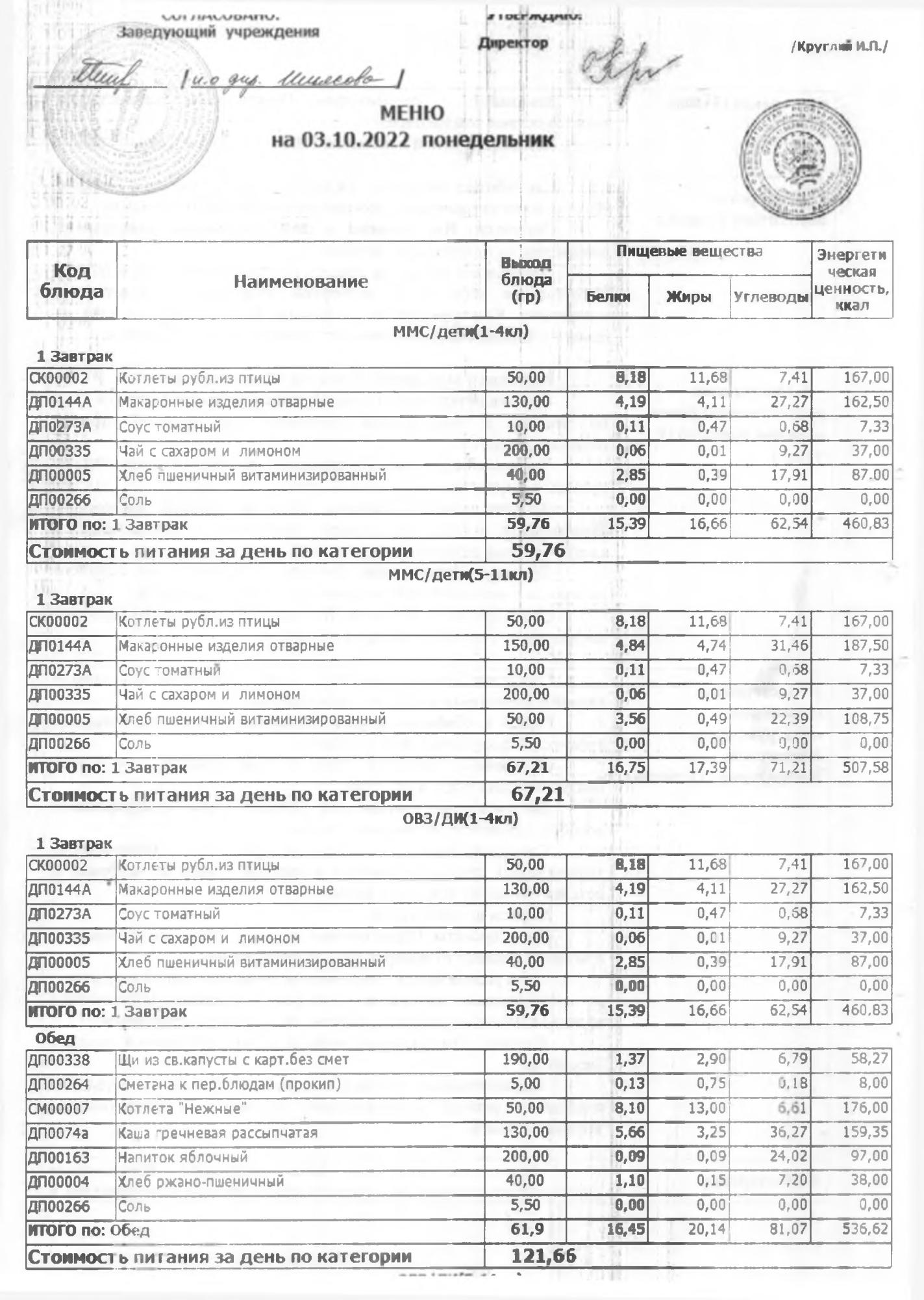 Стоимость школьного питания