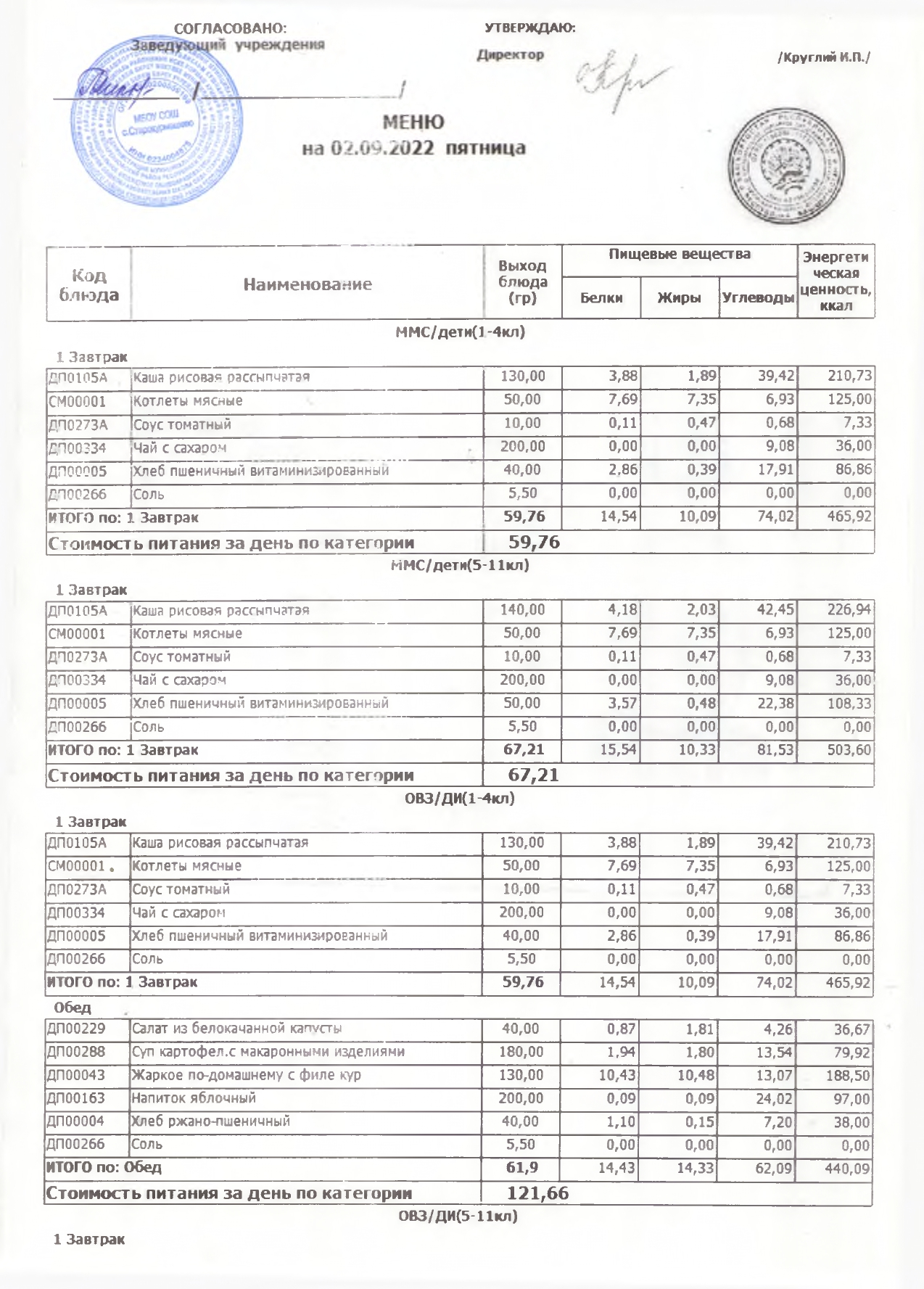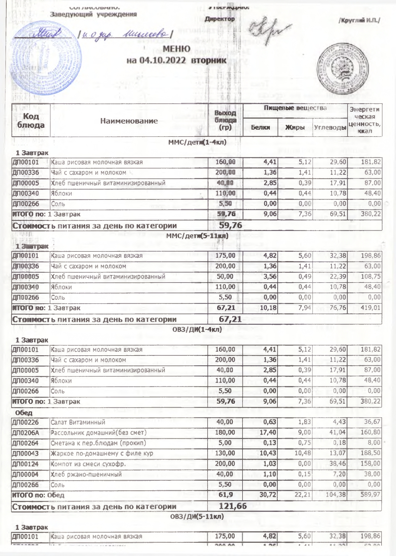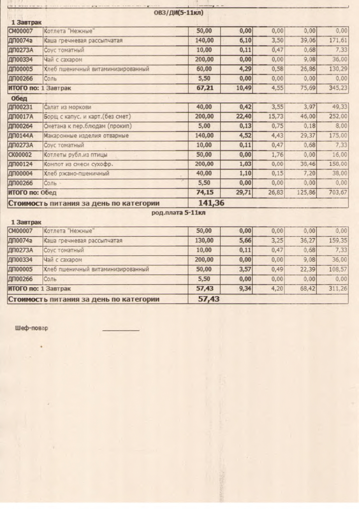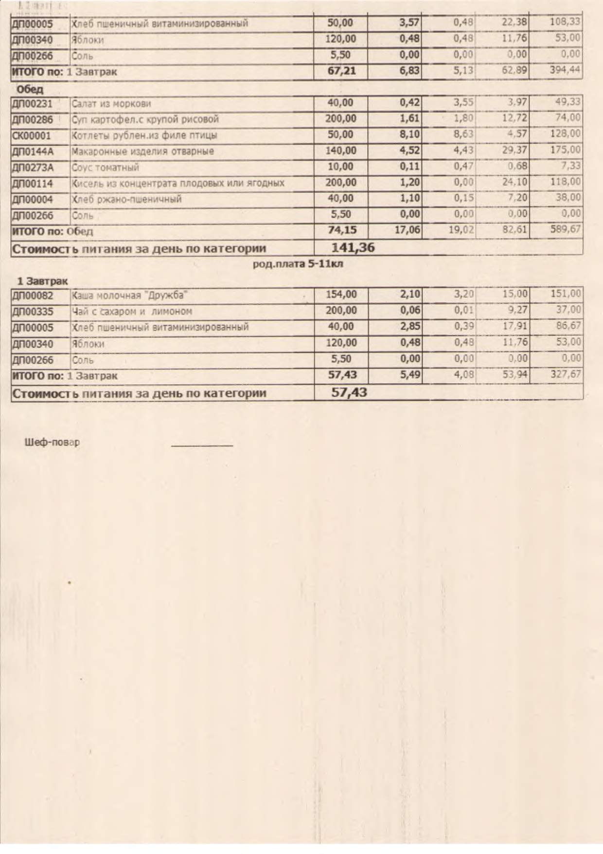 Стоимость школьного питания