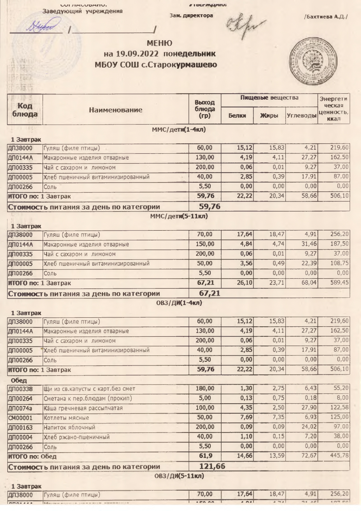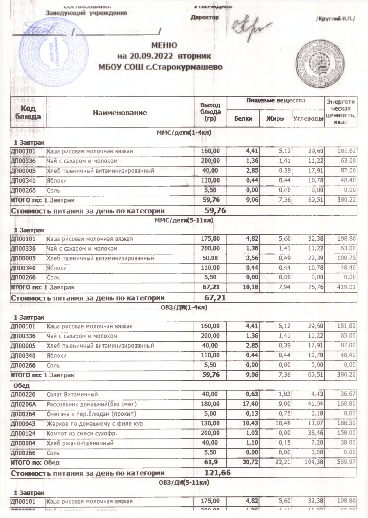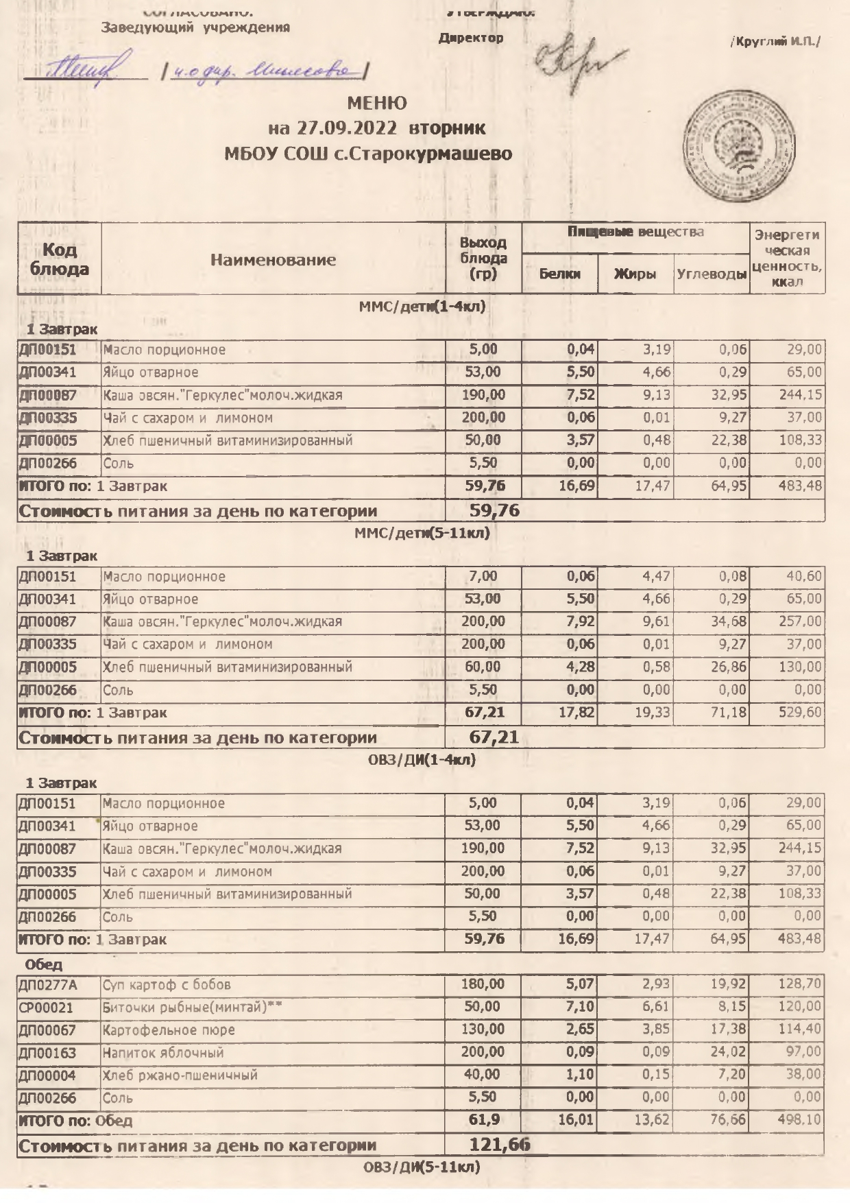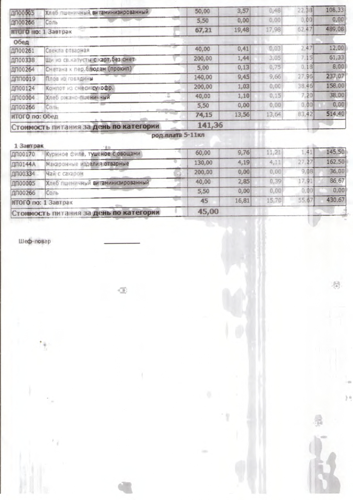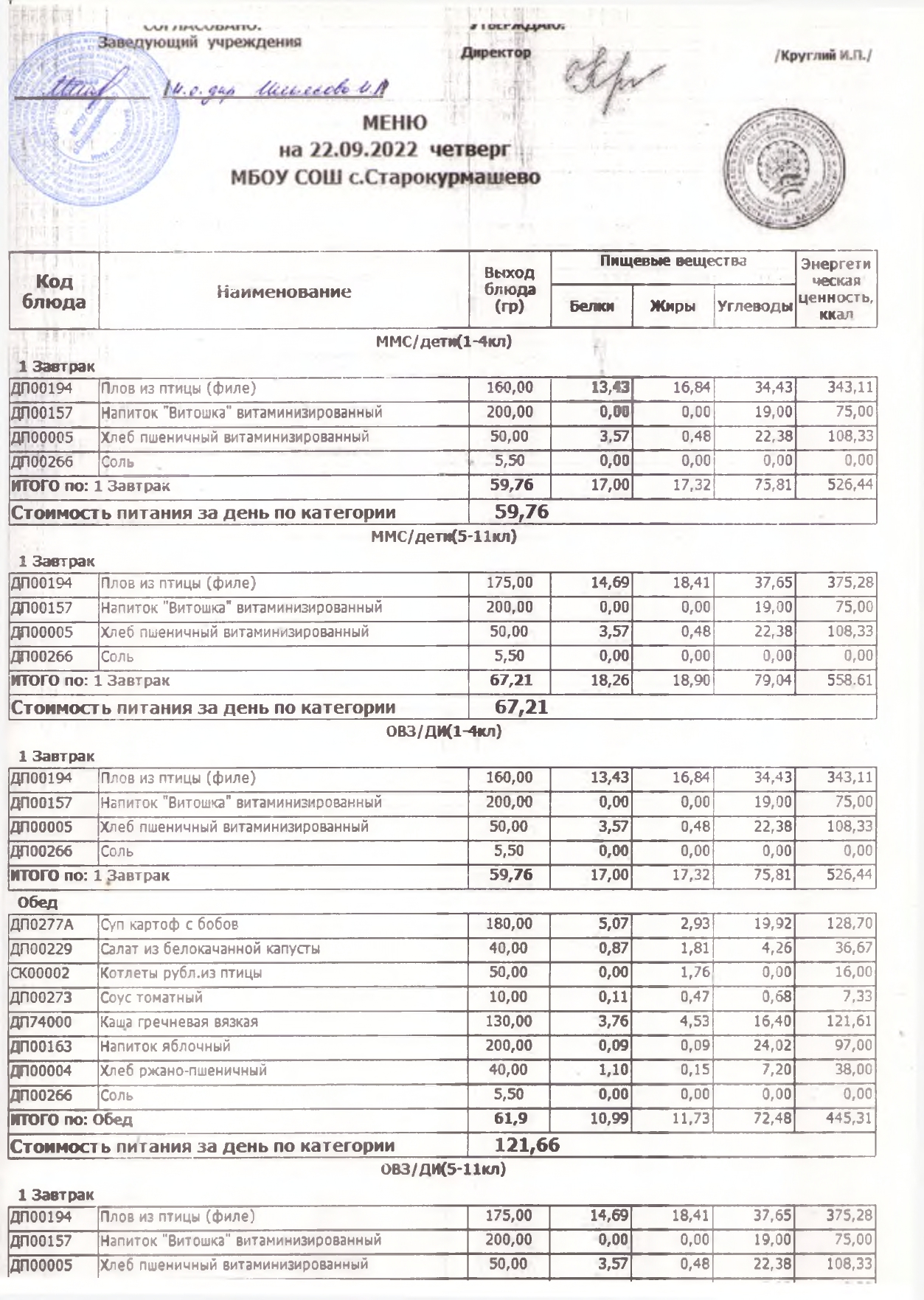 Стоимость школьного питания
