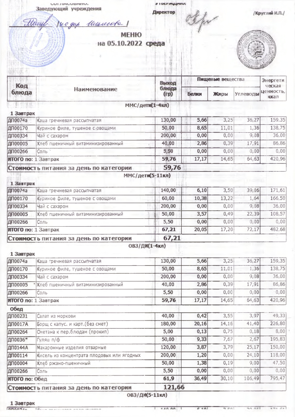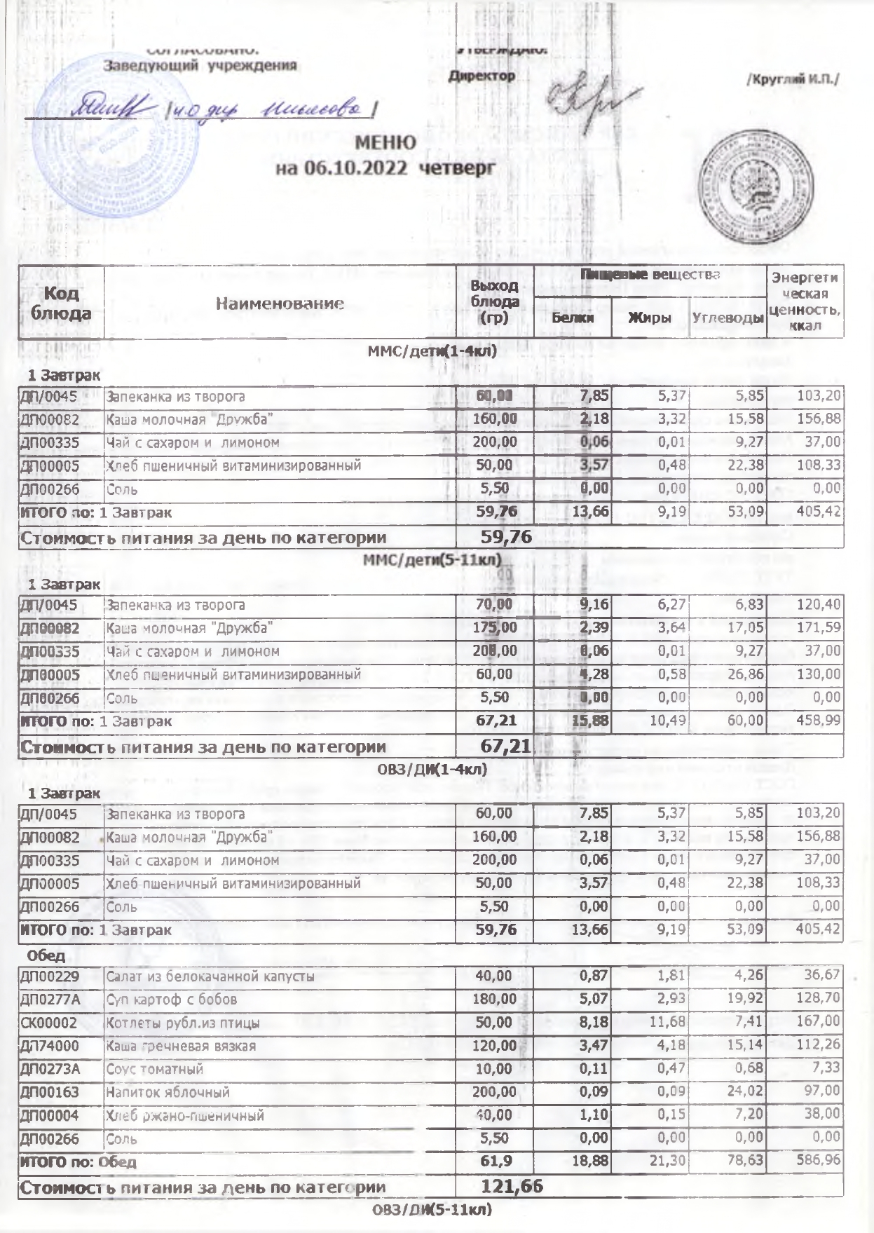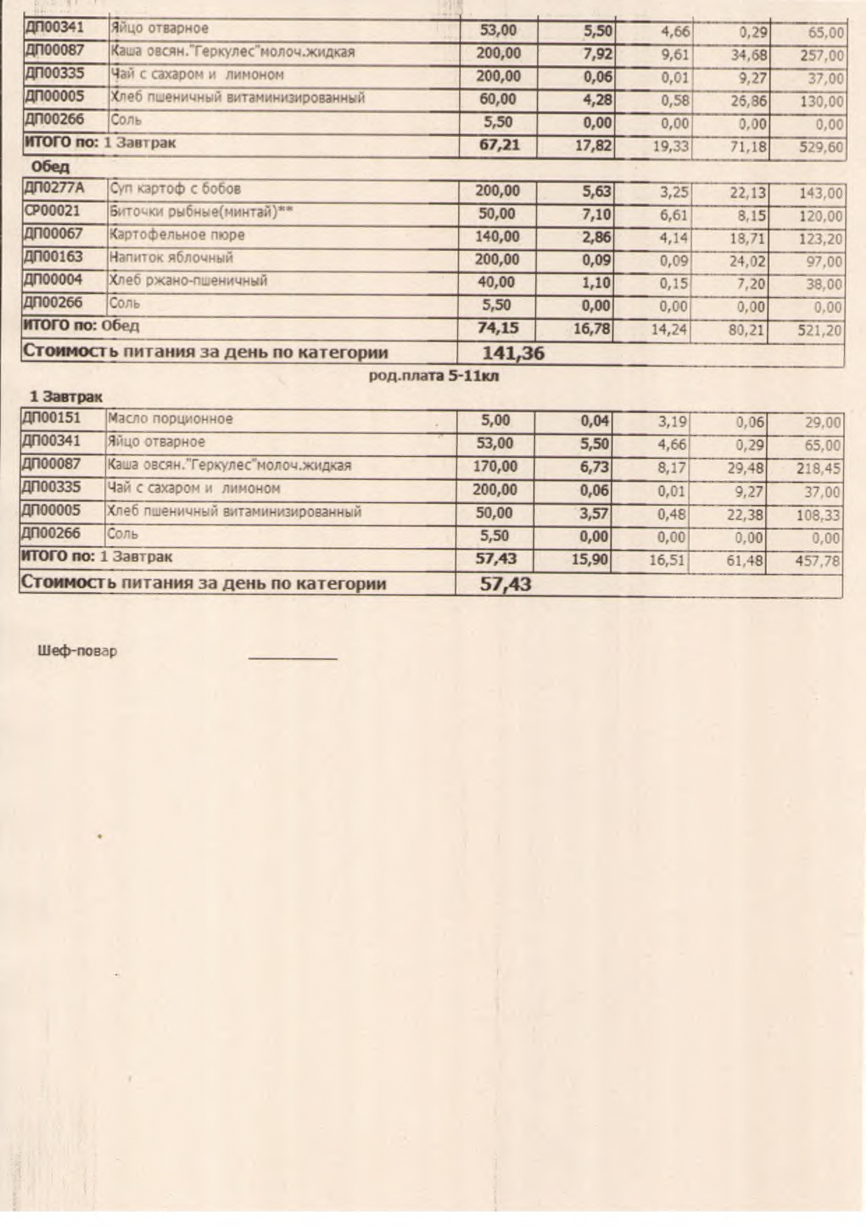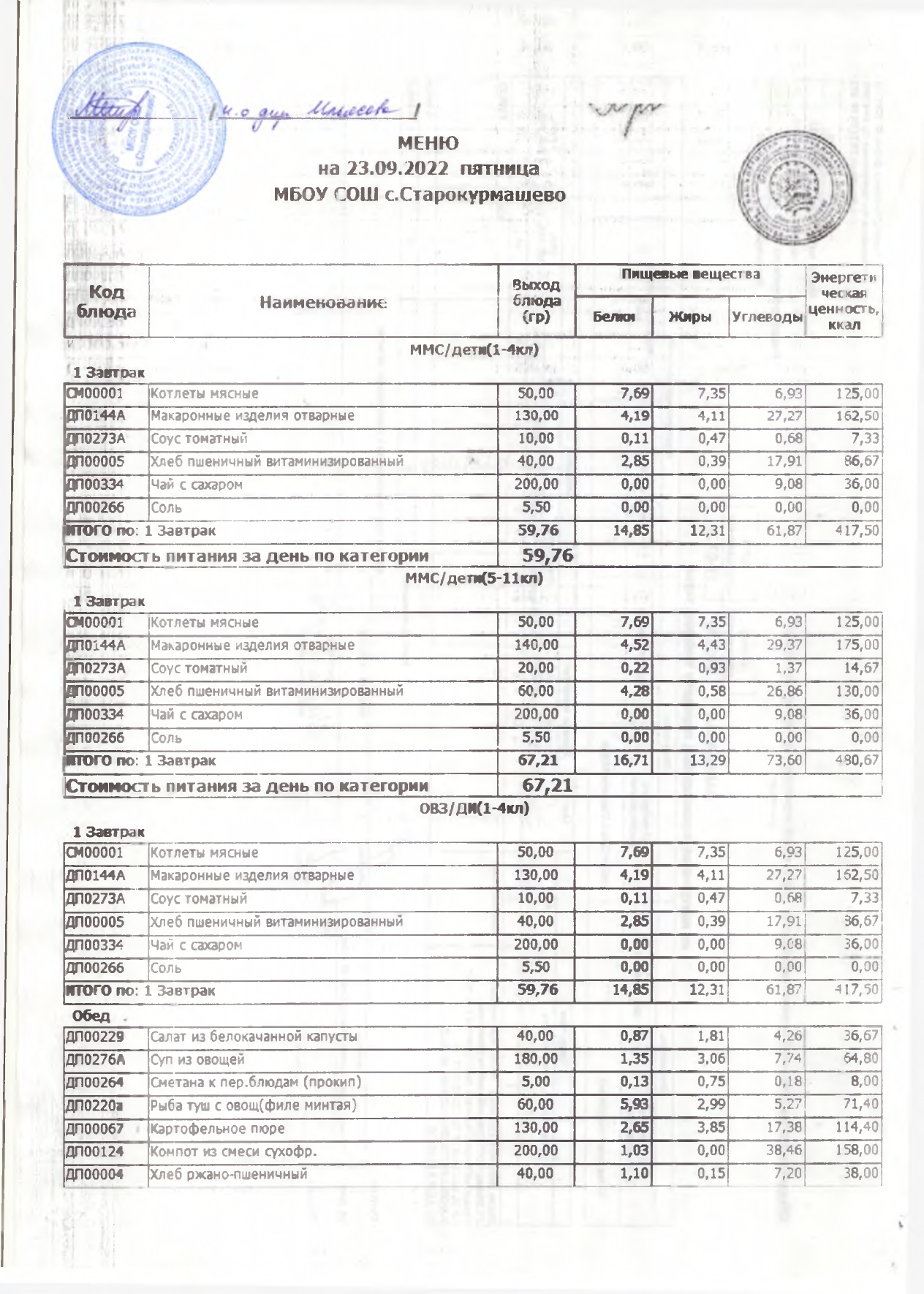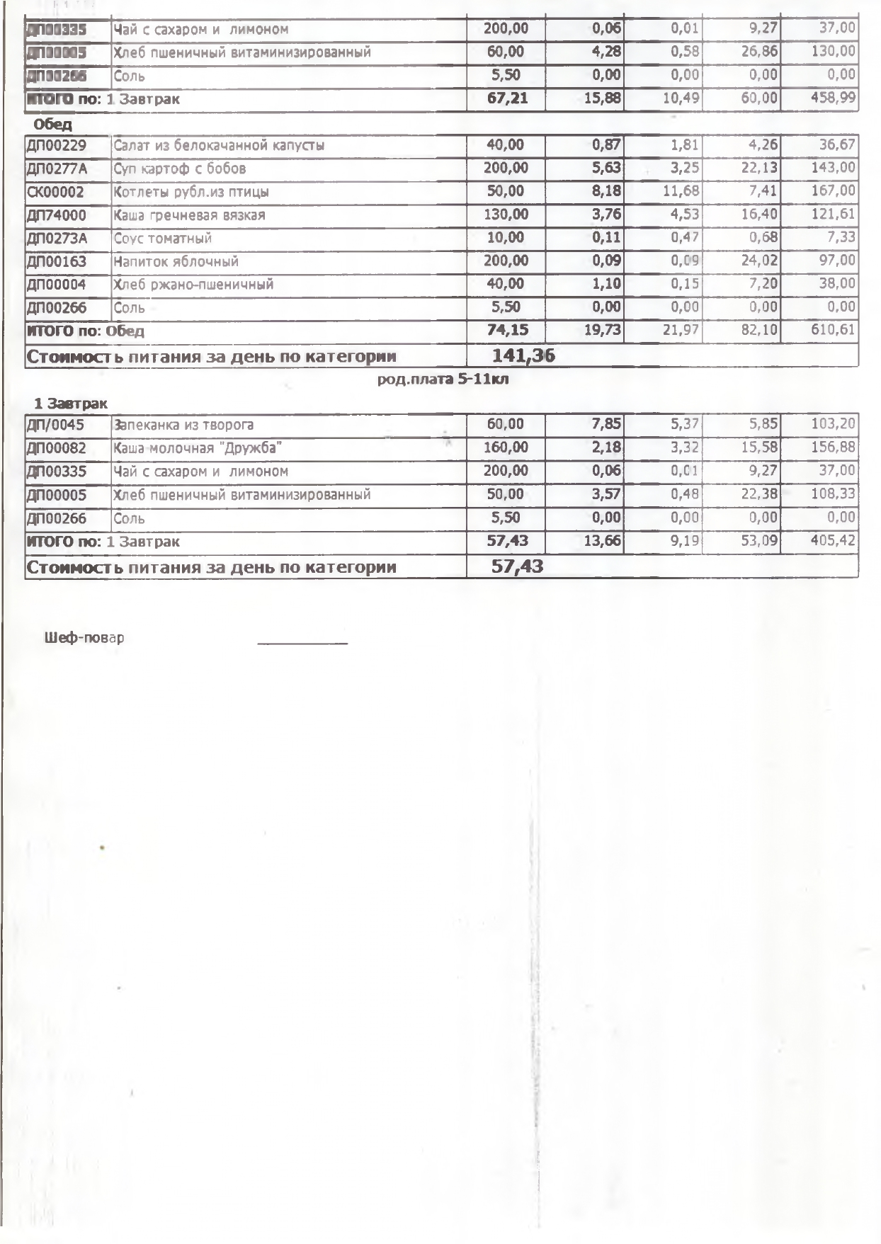 Стоимость школьного питания