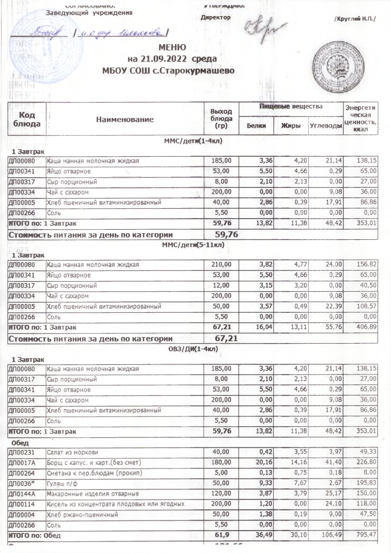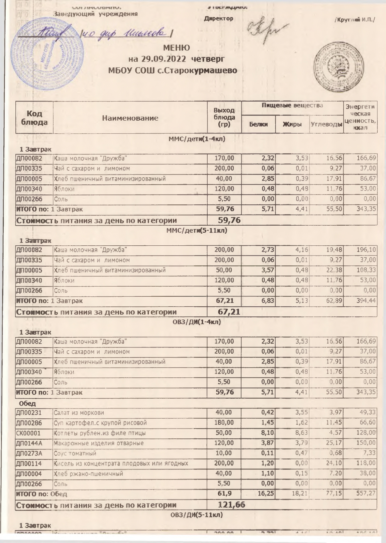 Примерное меню