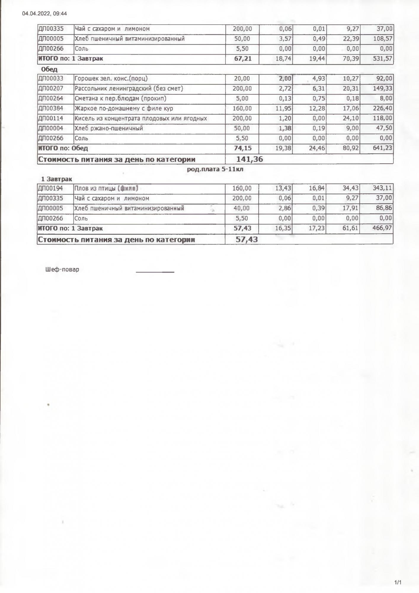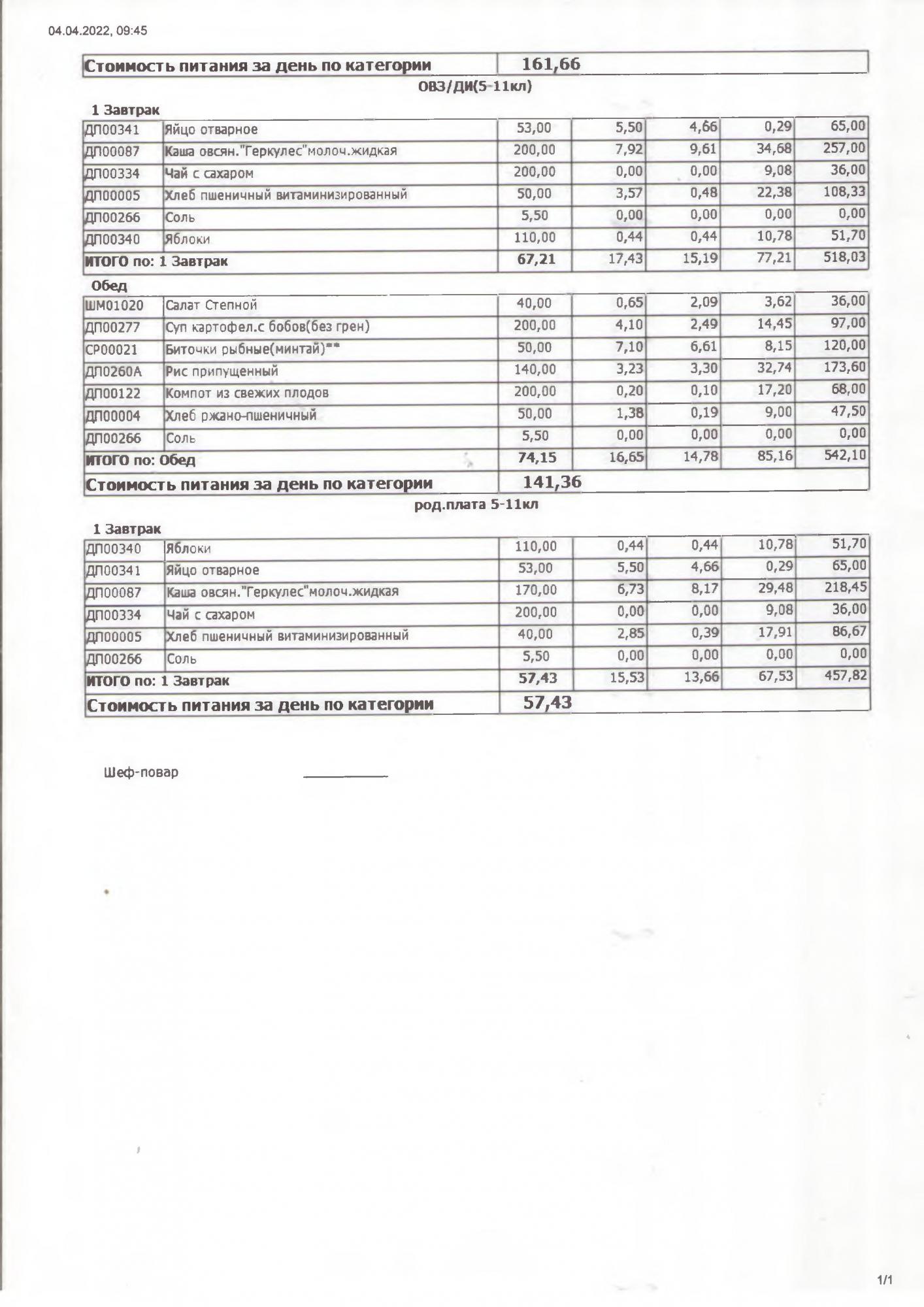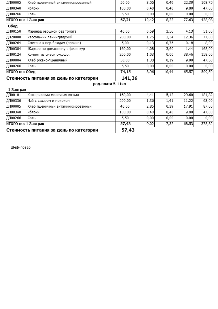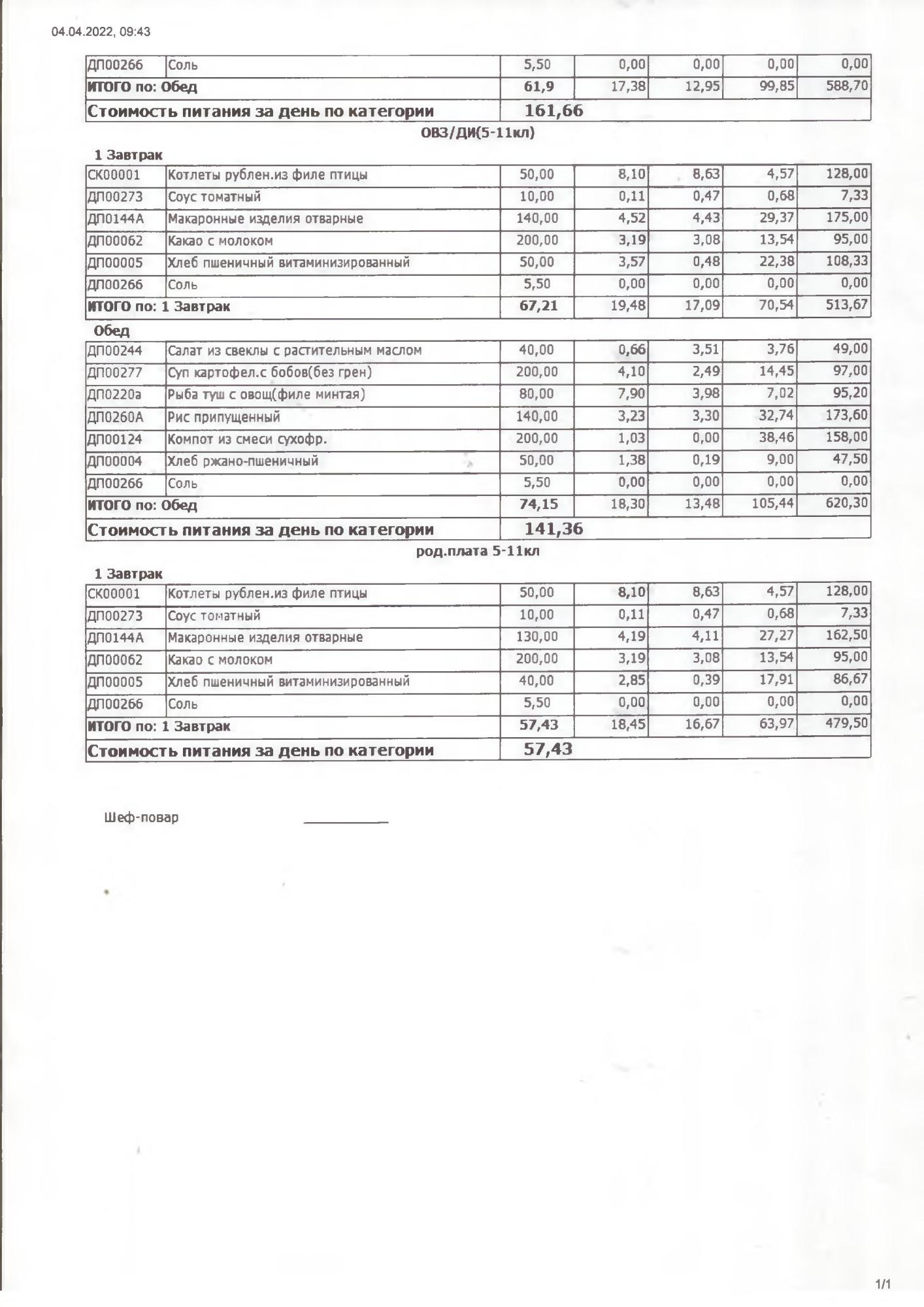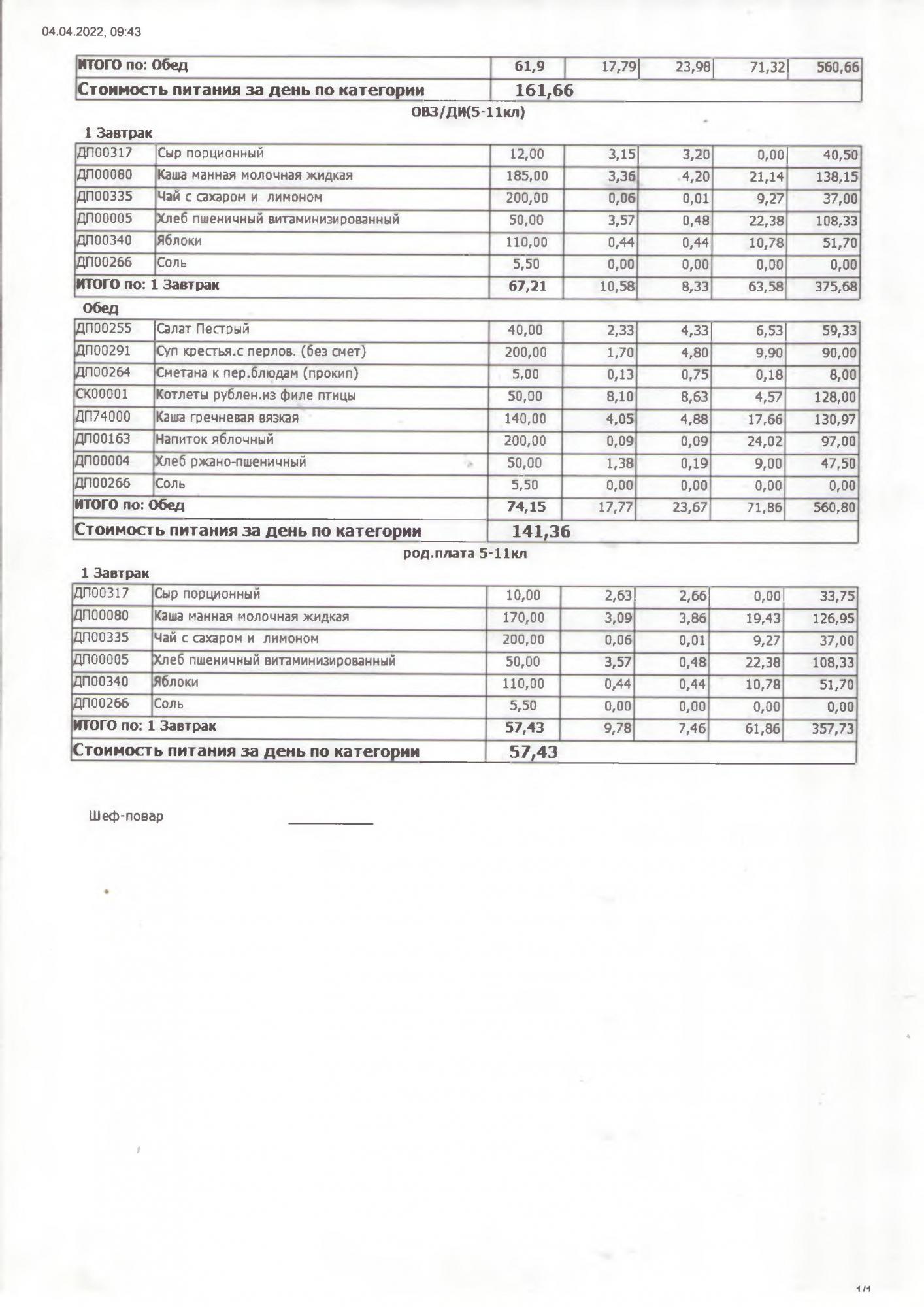 Стоимость школьного питания