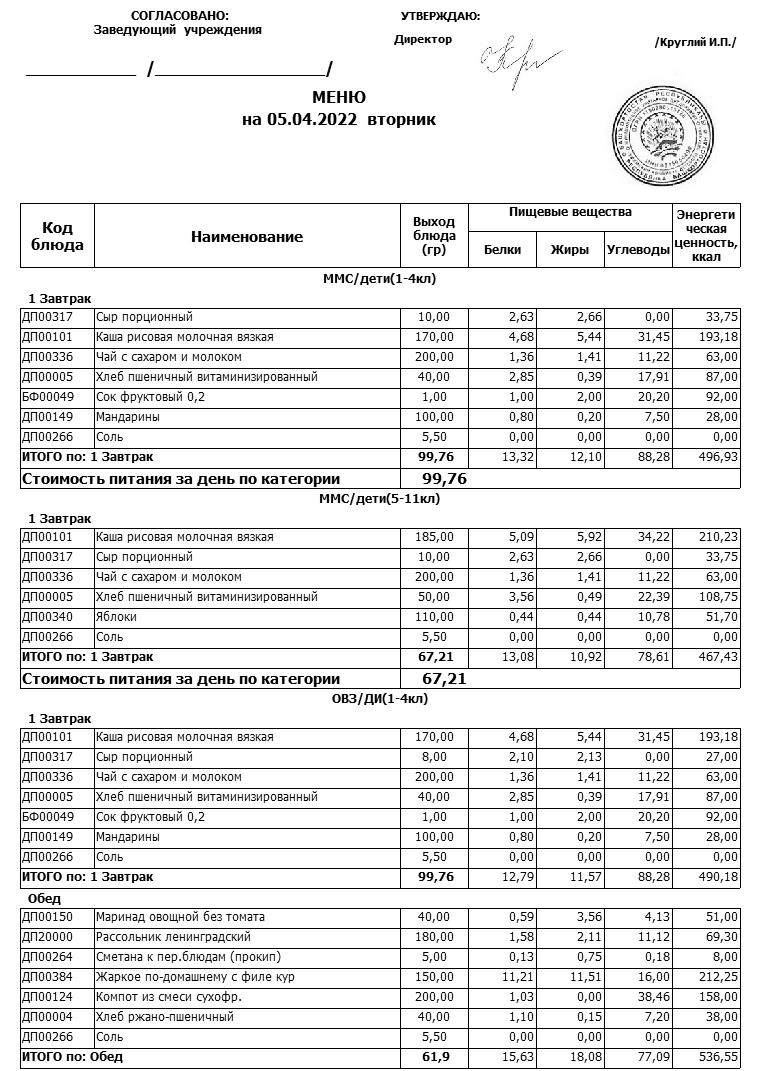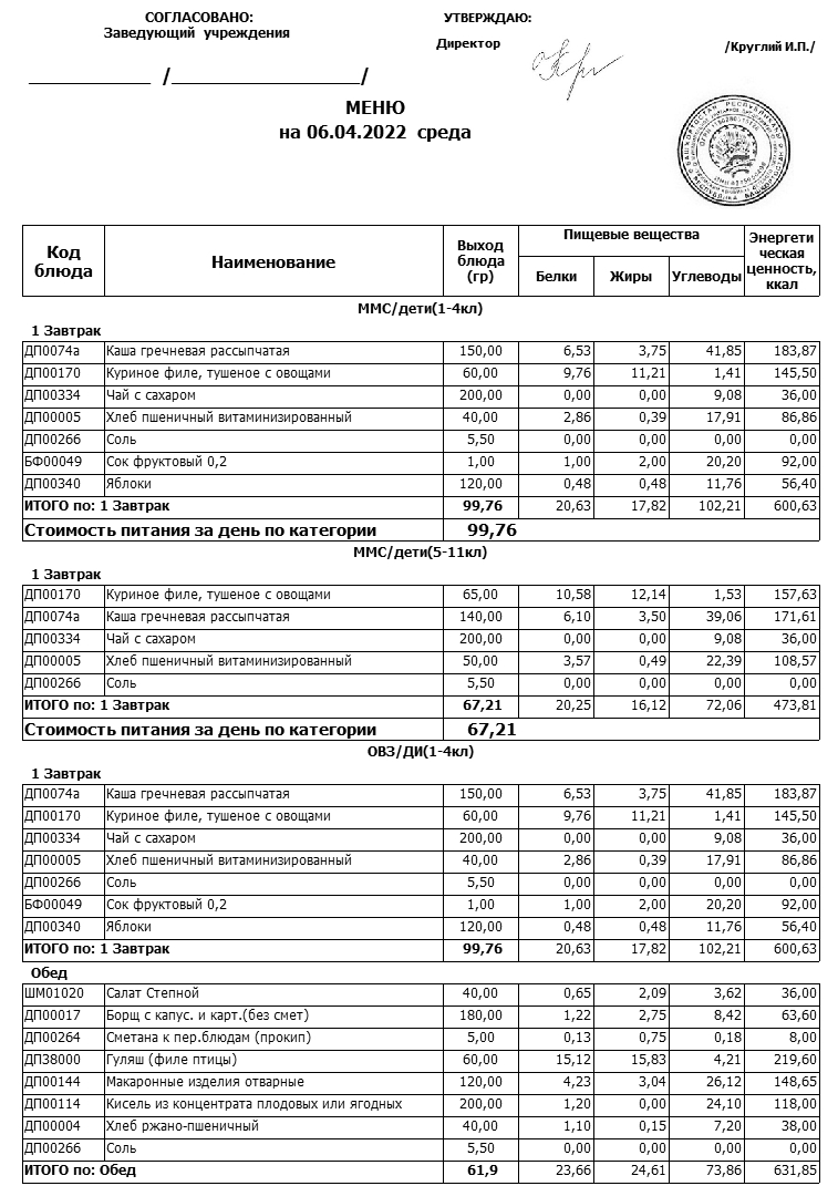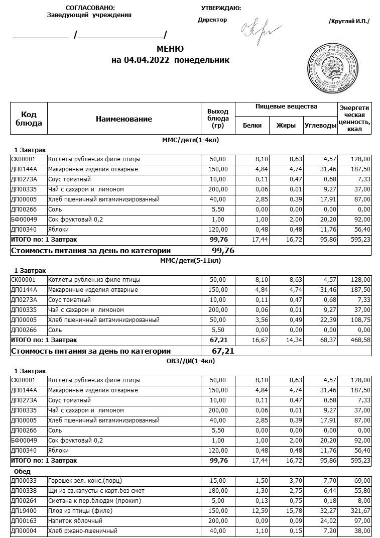 Примерное меню