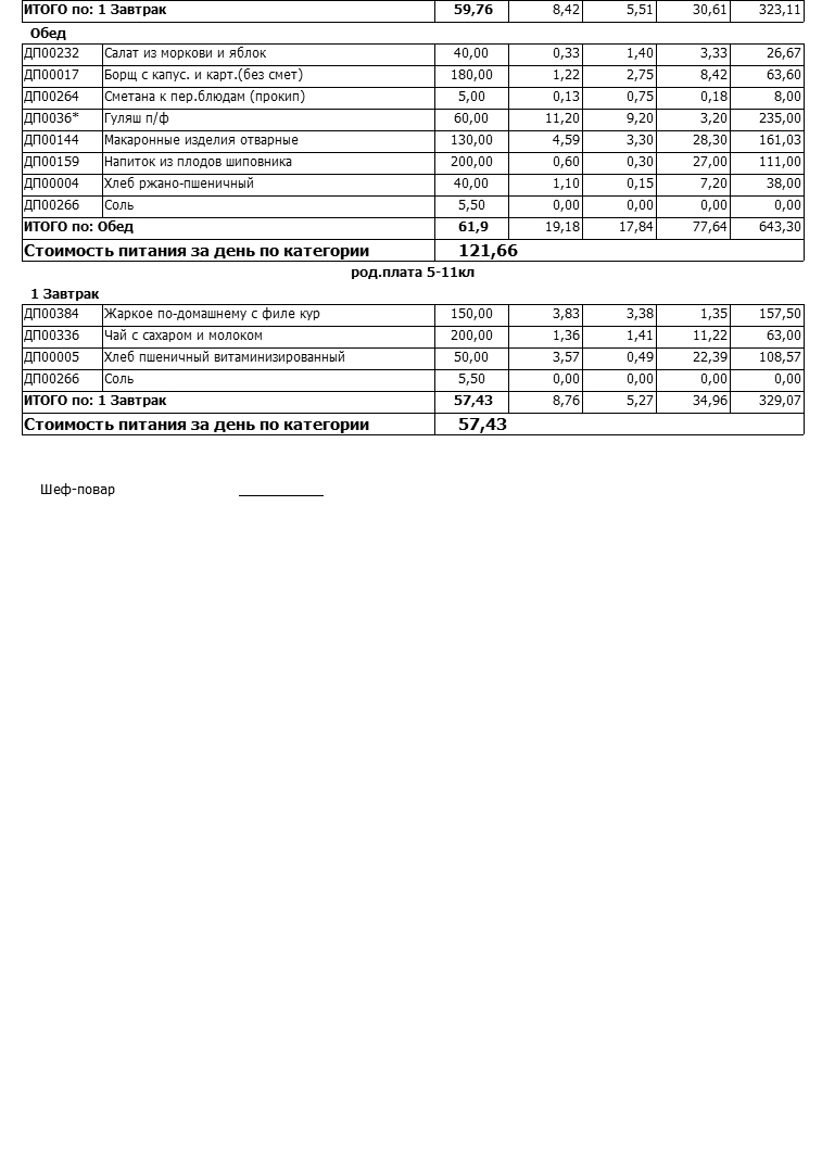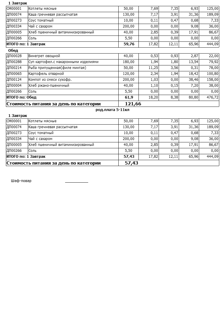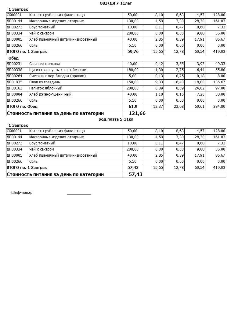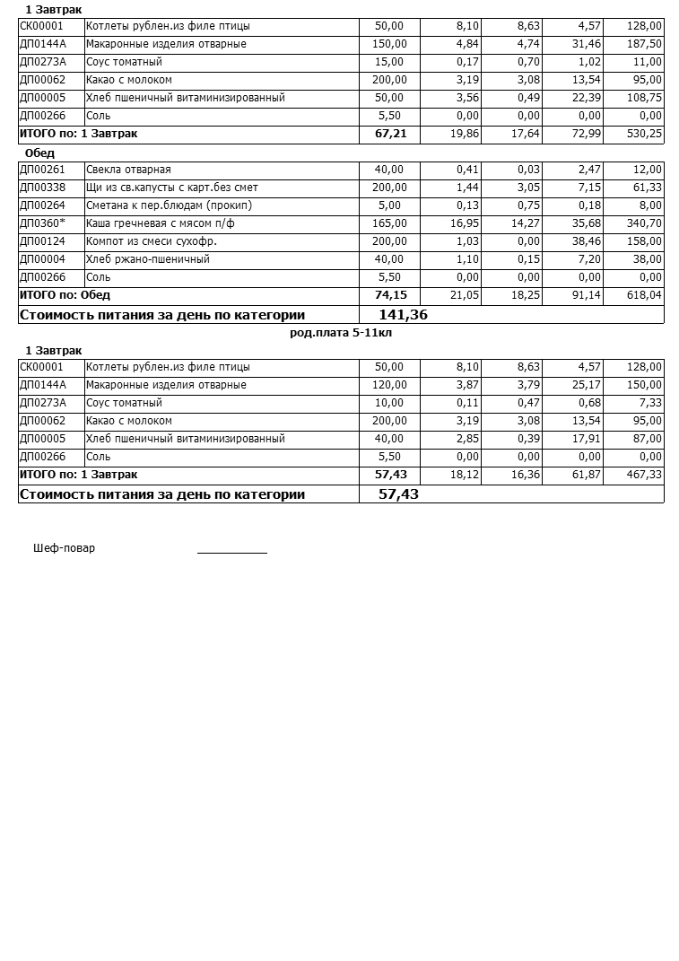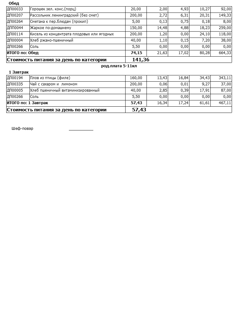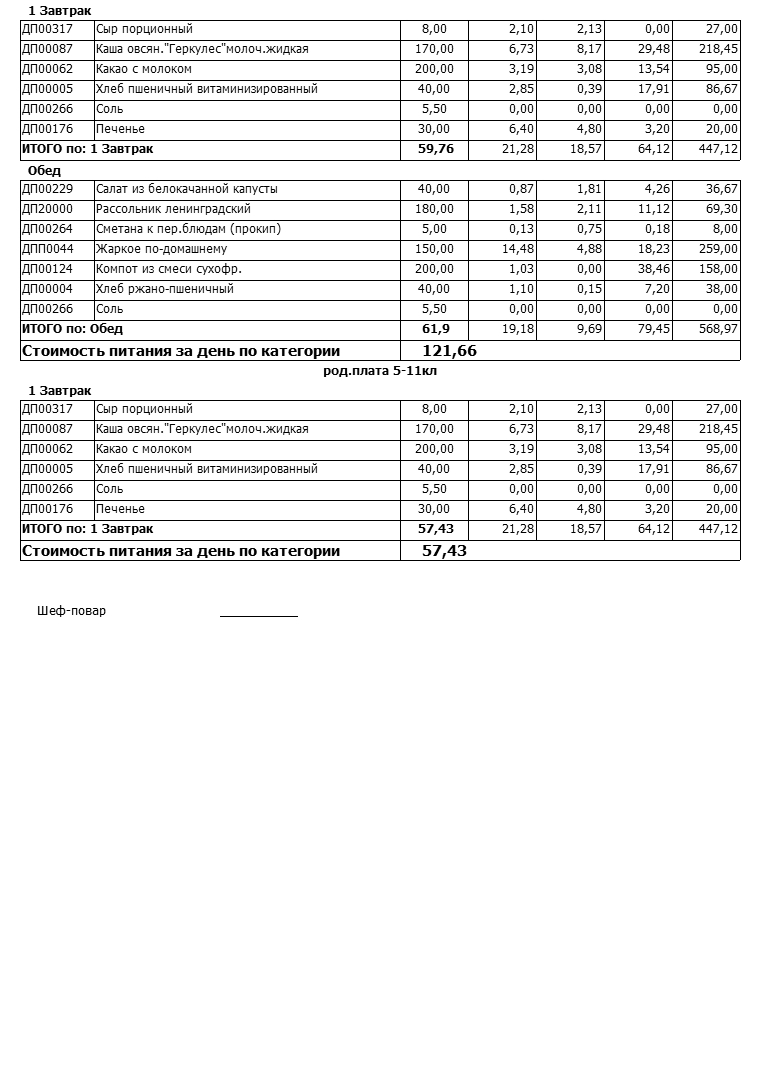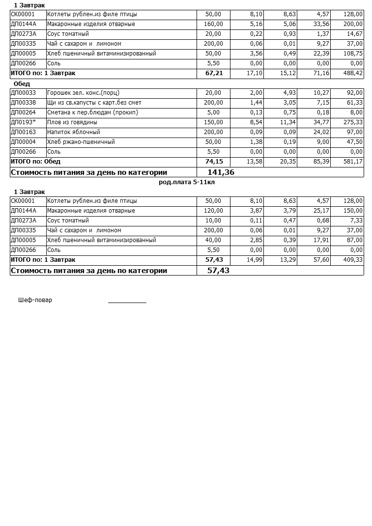 Стоимость школьного питания