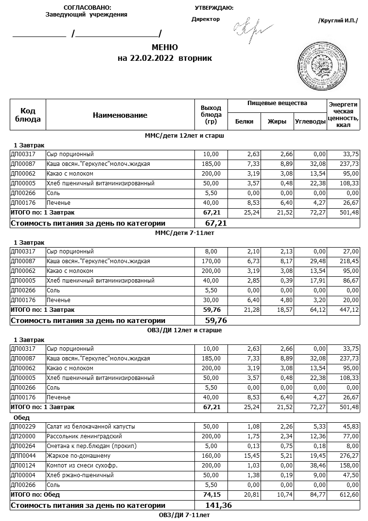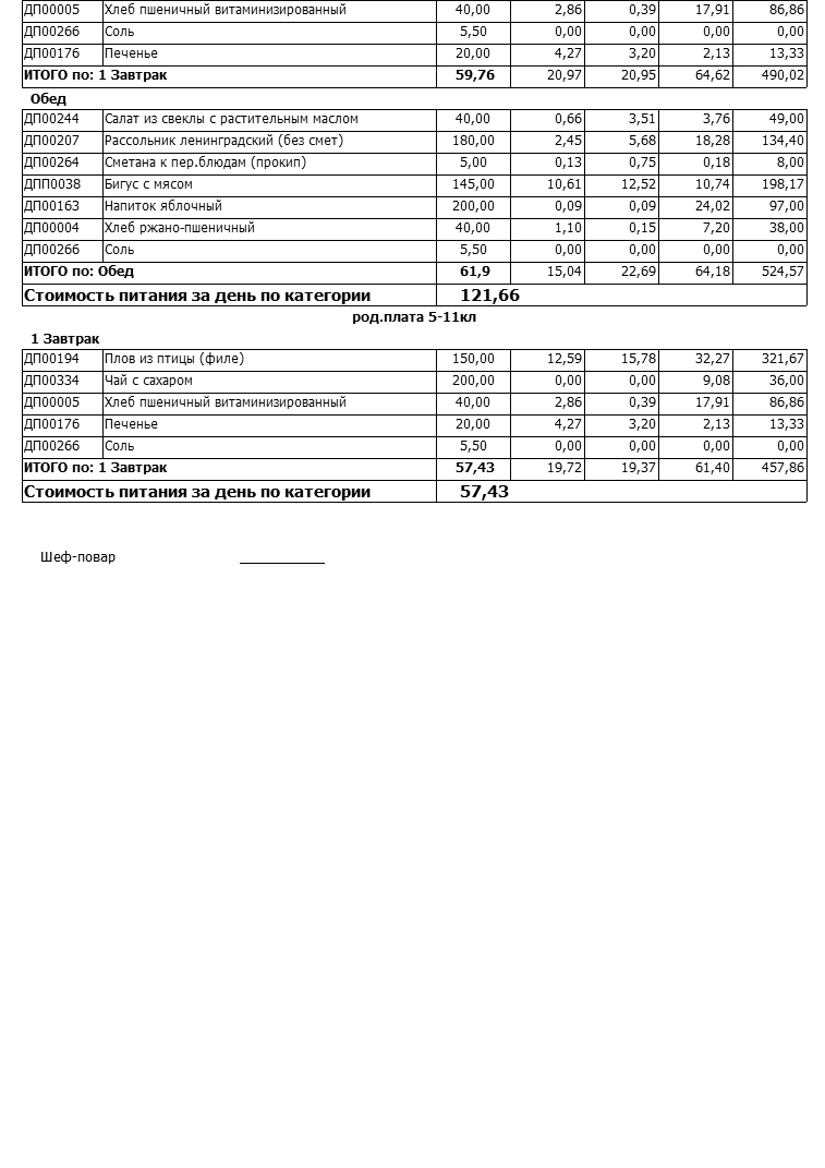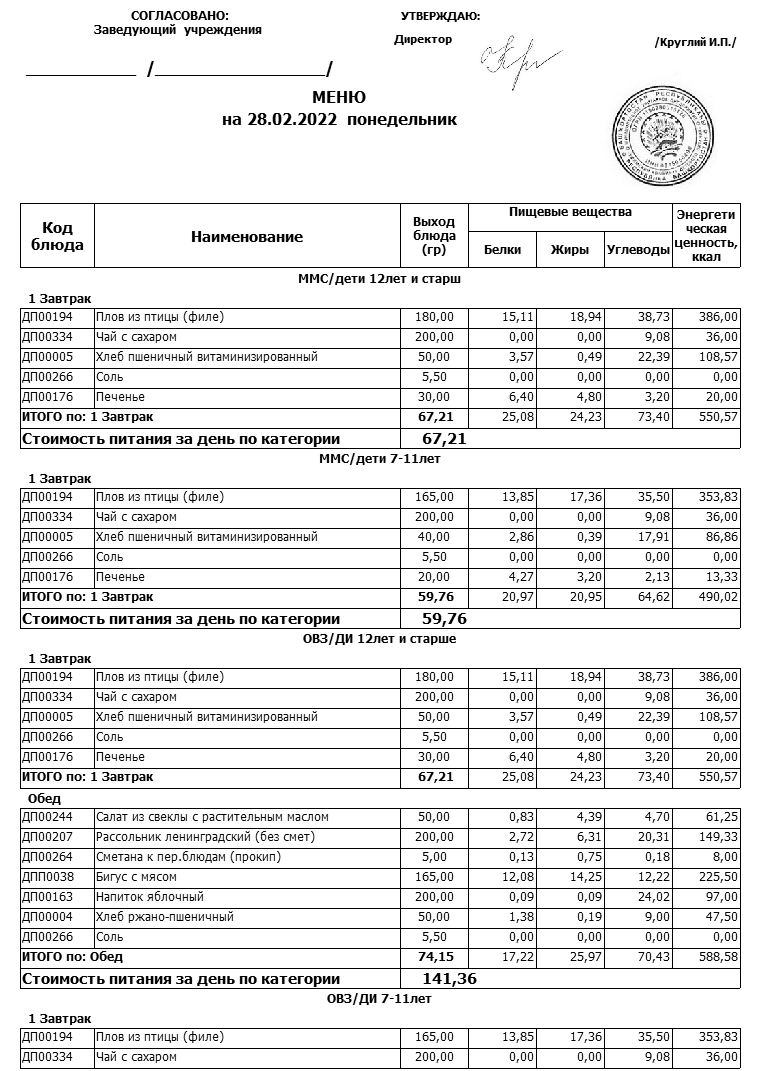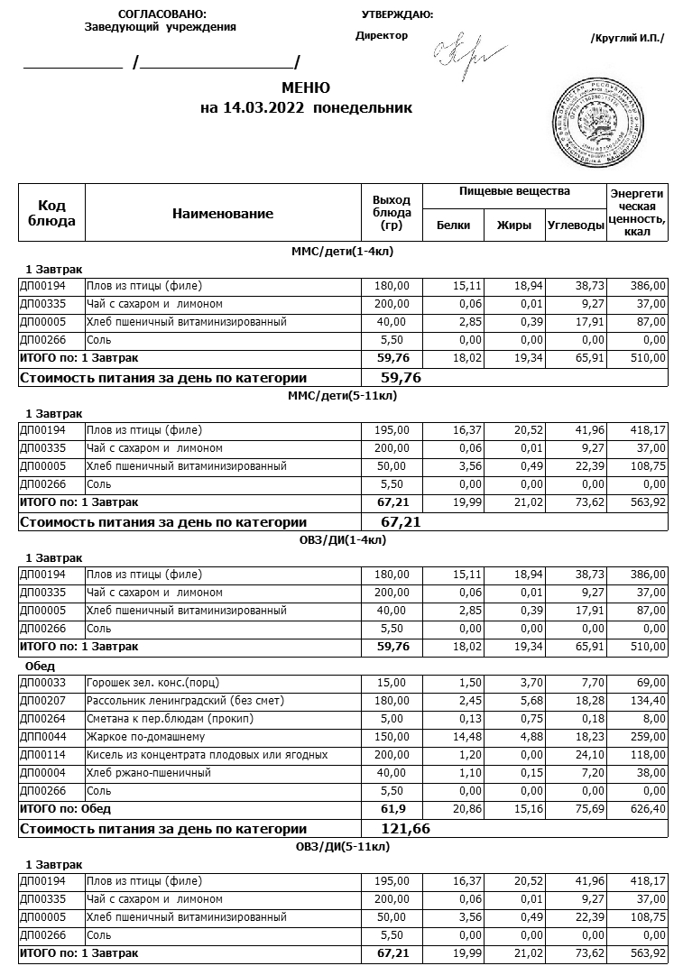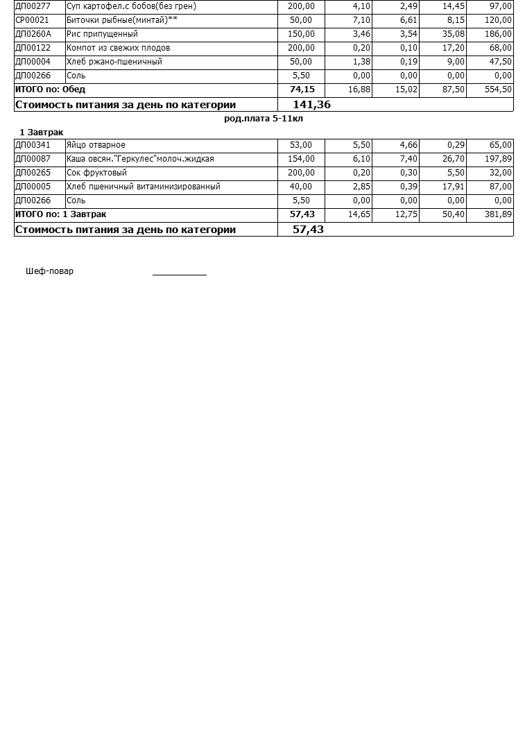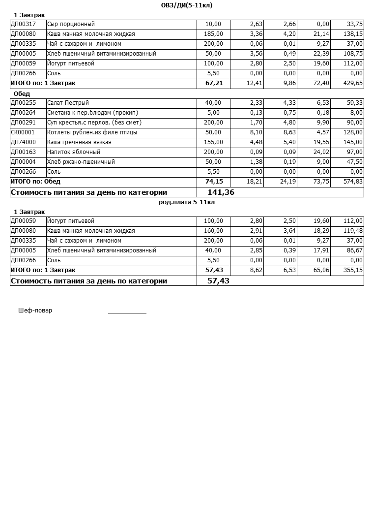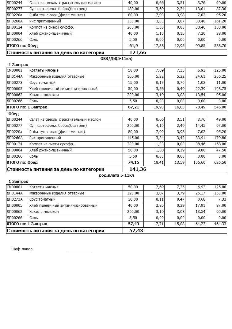 Стоимость школьного питания