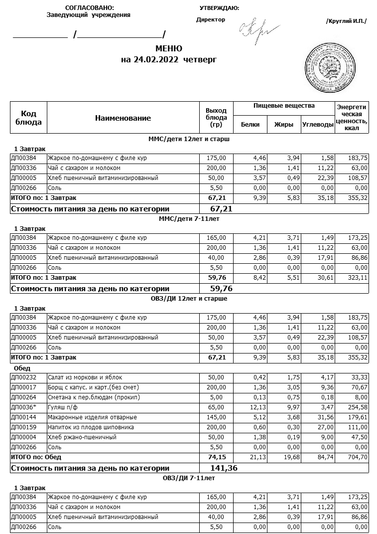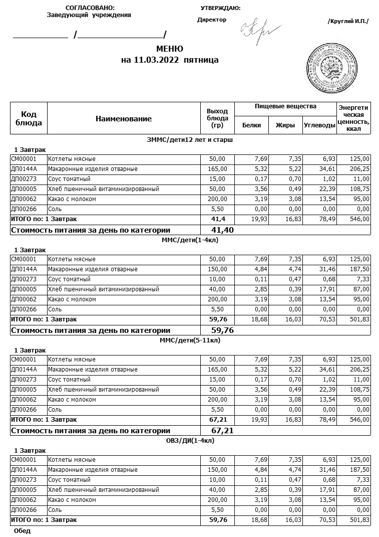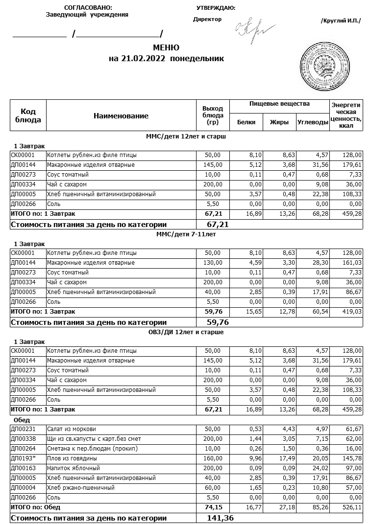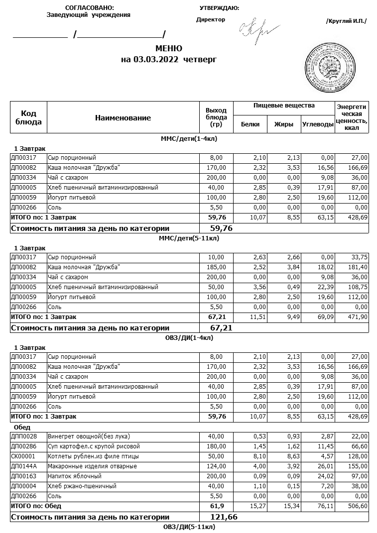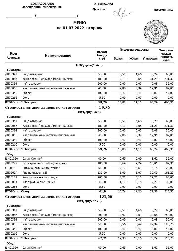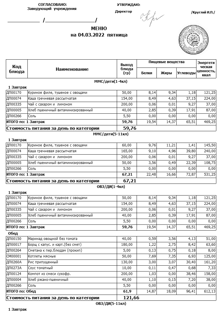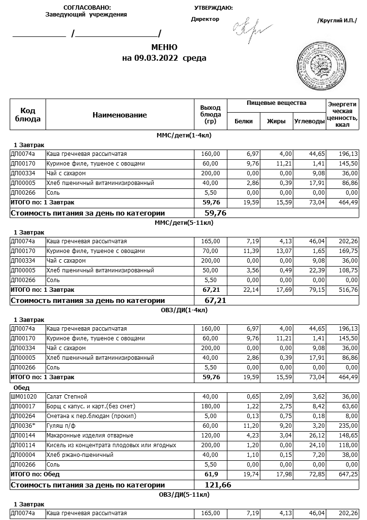 Примерное меню