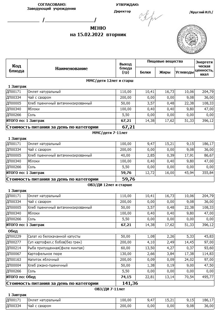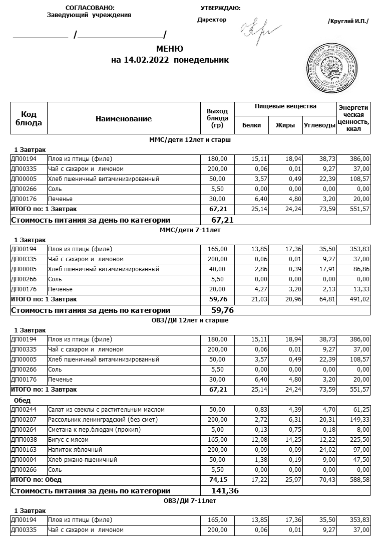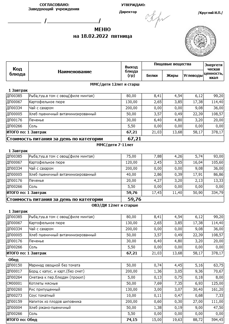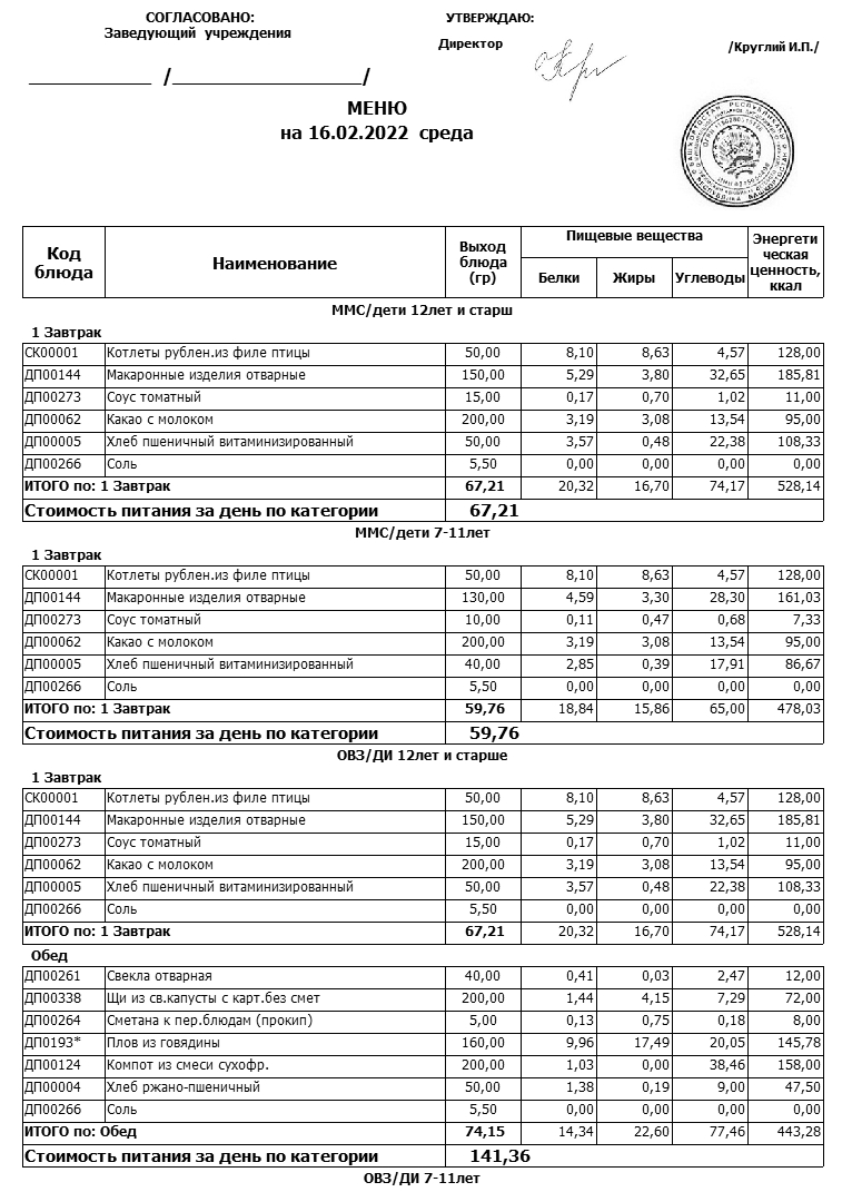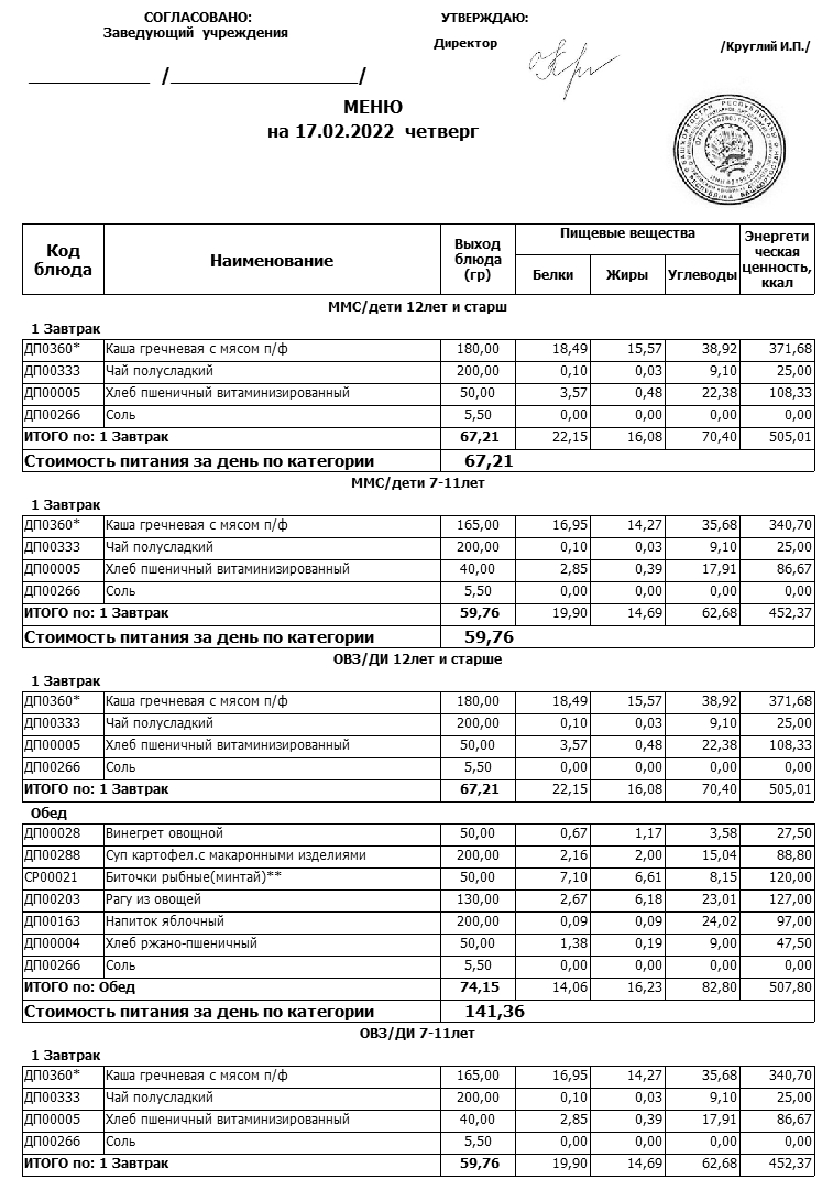 Примерное меню