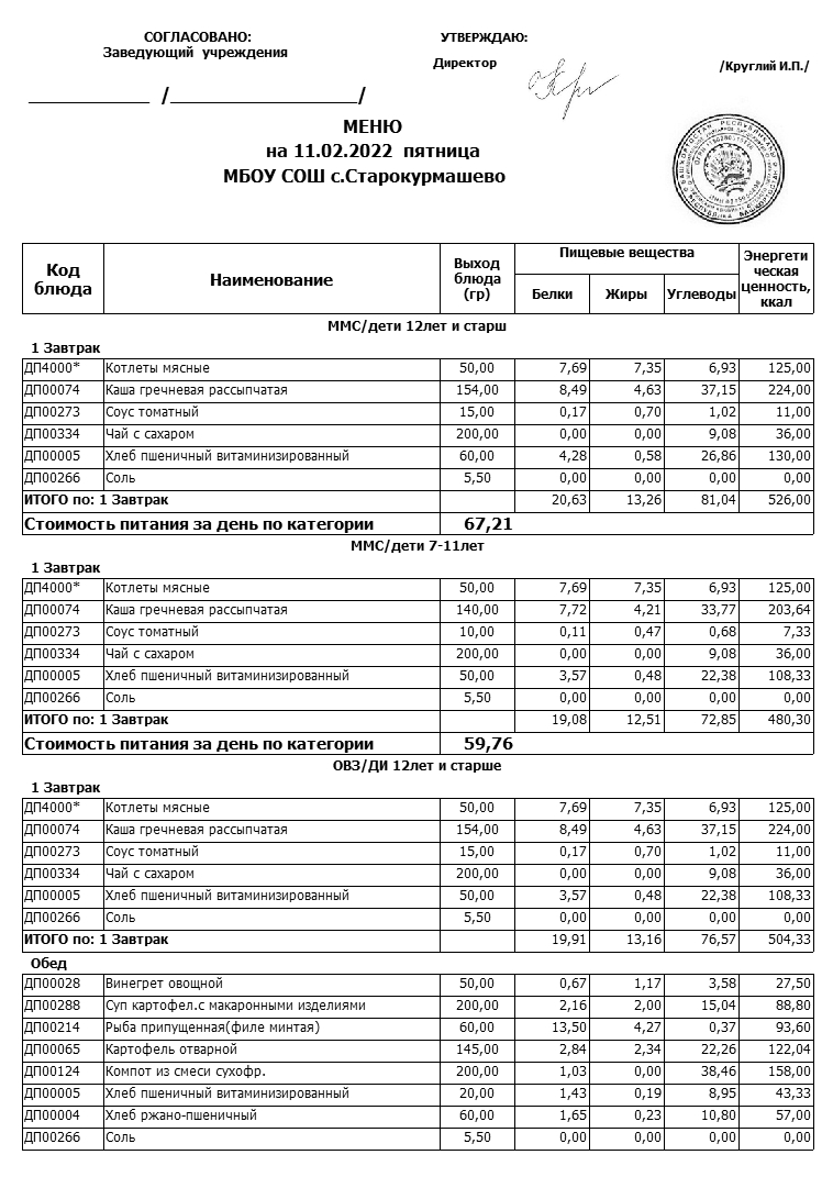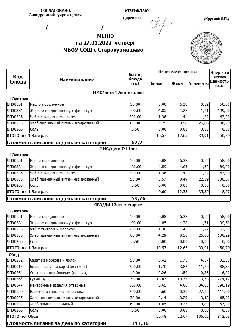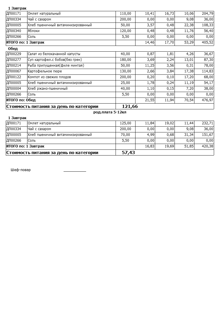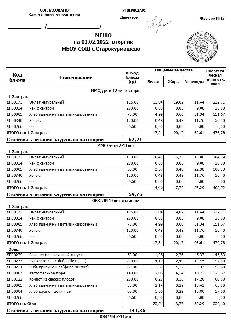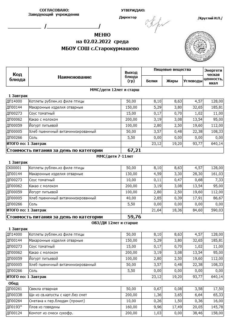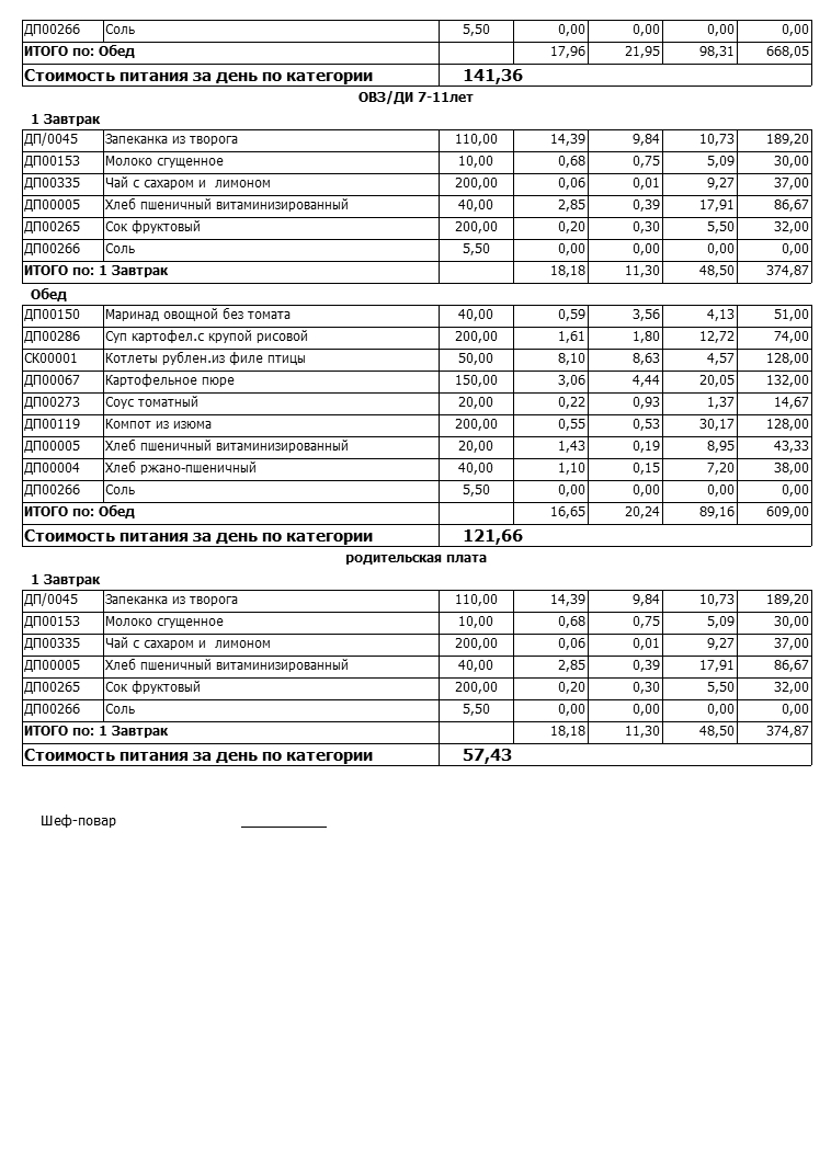 Примерное меню