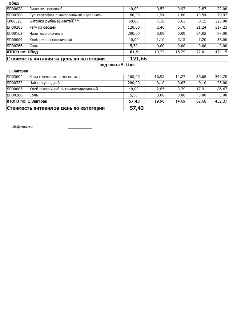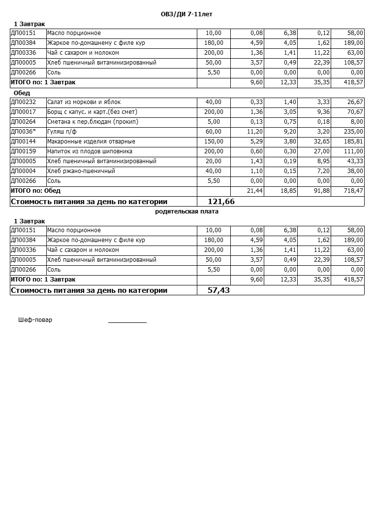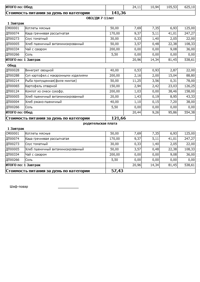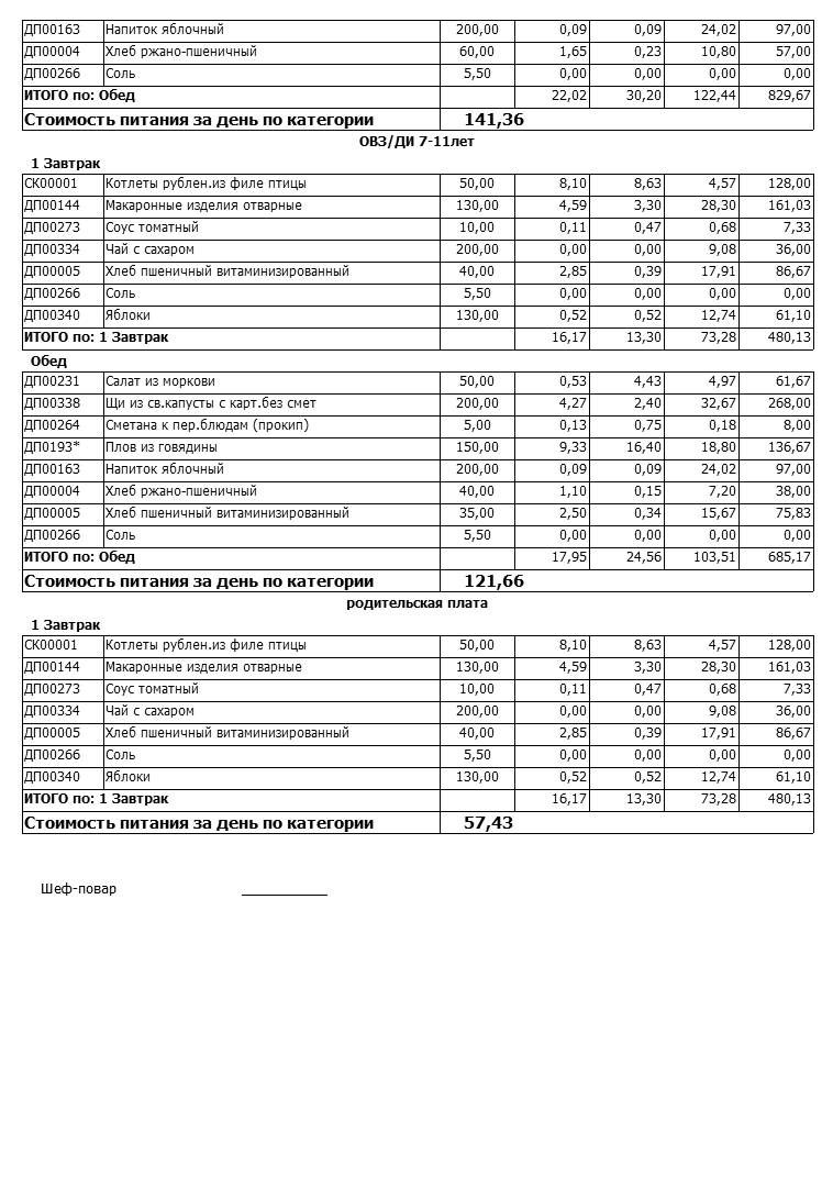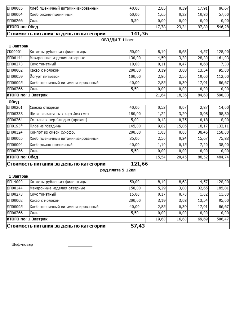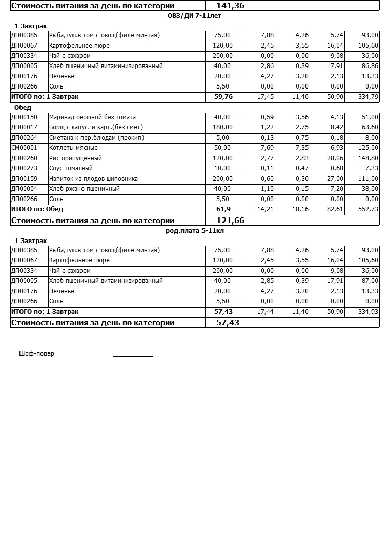 Стоимость школьного питания