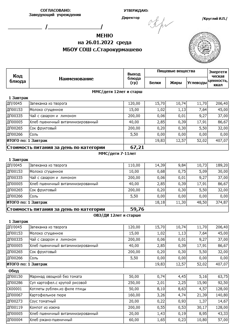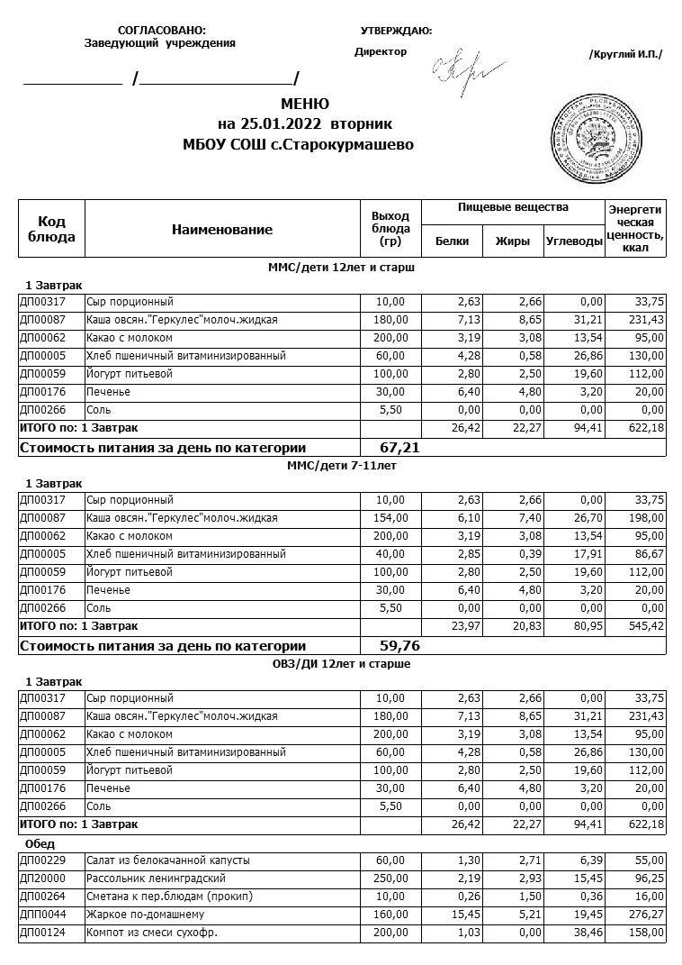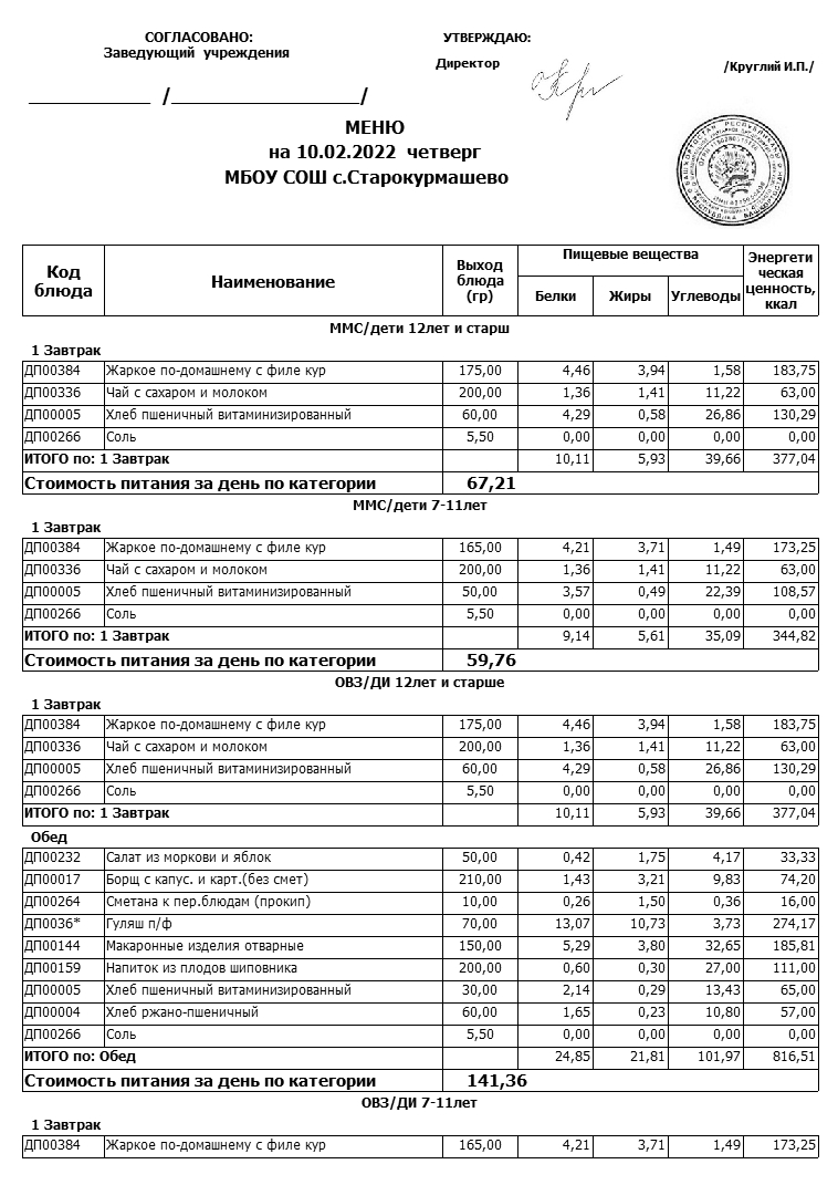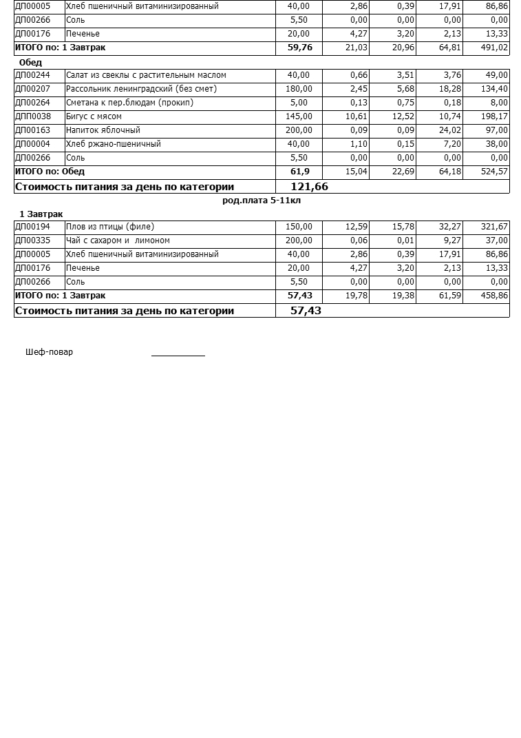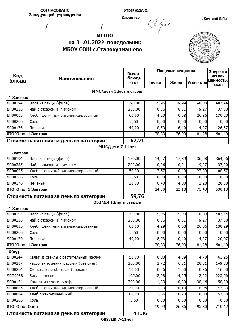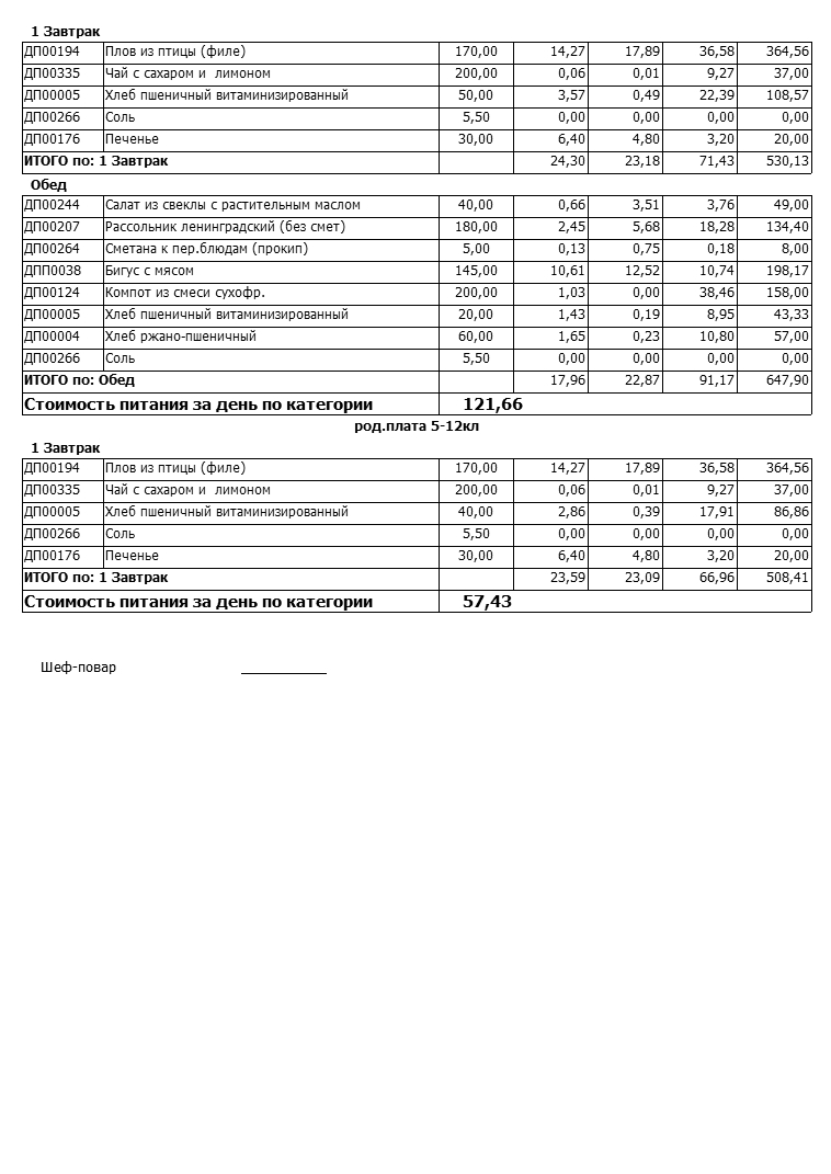 Стоимость школьного питания