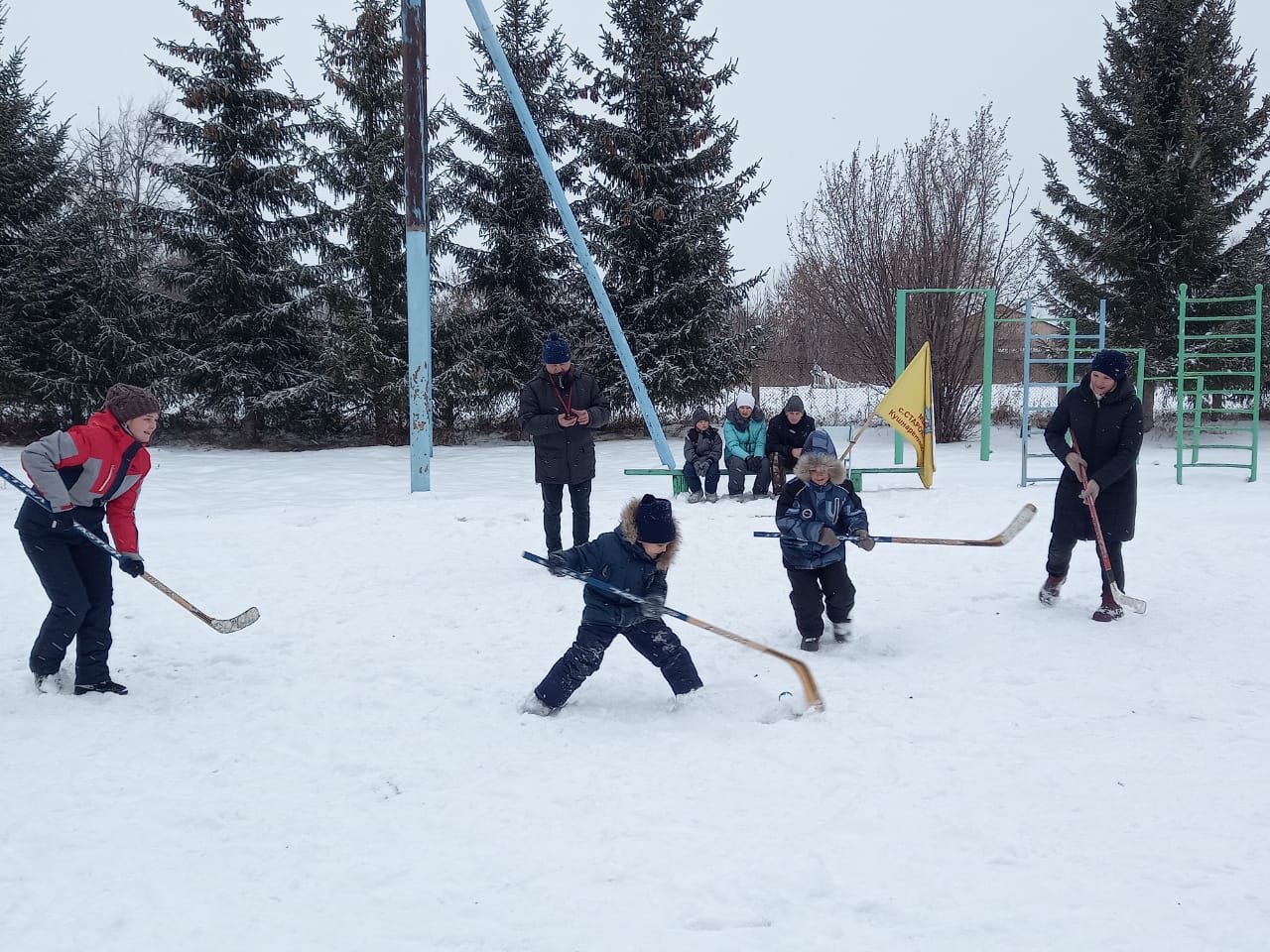В прекрасную зимнюю погоду возле наряженной елки были проведены такие игры, как хоккей в валенках, эстафеты: «катание на санках», «катание на тюбинге». Дети с огромным желанием победы играли во все игры, а родители с удовольствием их поддерживали и вдохновляли.